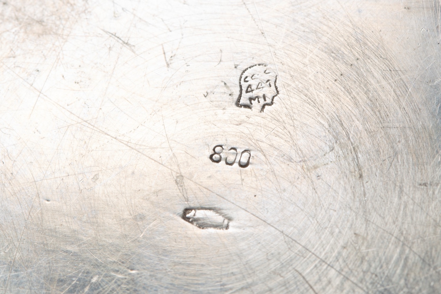 composto da un piatto a bordo sbalzato a frutti concatenati, otto sottobicchieri, un sottobottiglia con bordo cesellato a palmette.