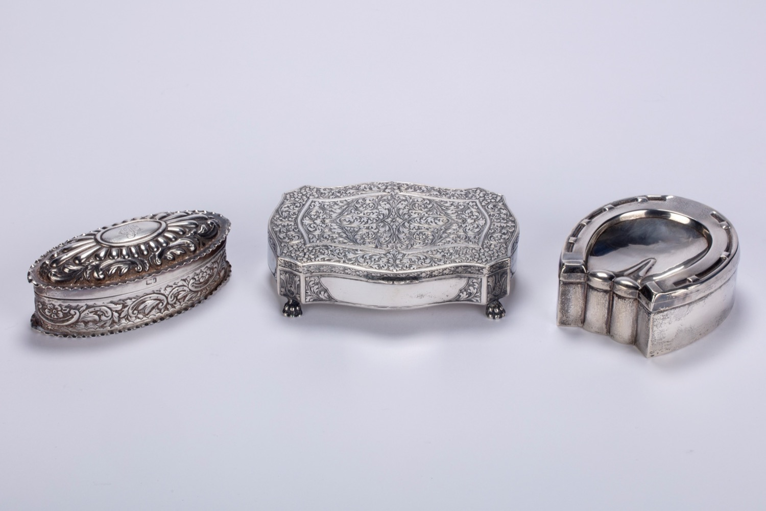 una di forma ovale in stile vittoriano, una sagomata con coperchio cesellato e una a forma di ferro di cavallo.