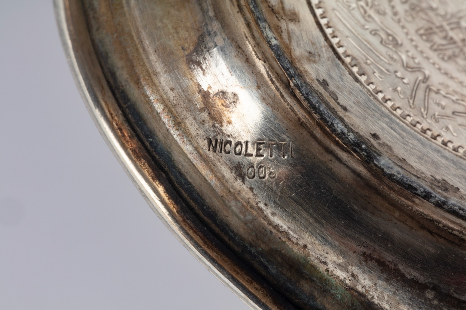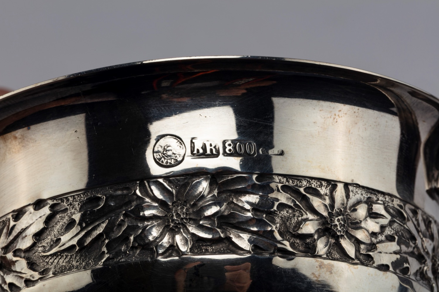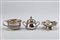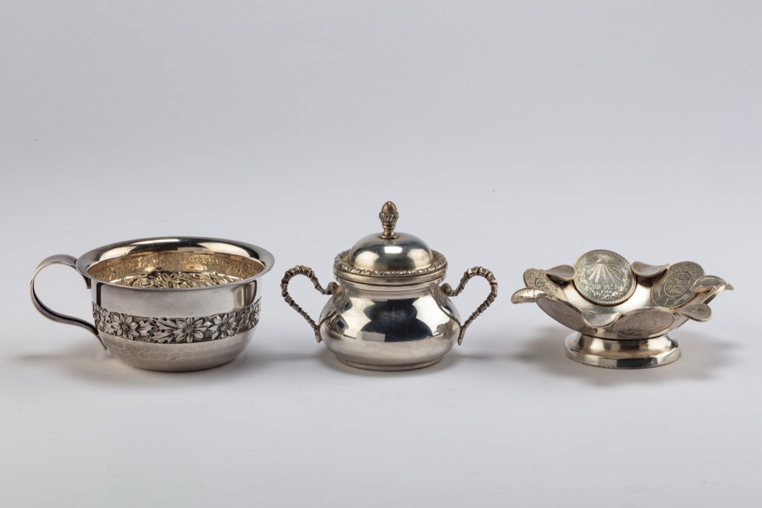 di diversa foggia ed uso, una zuccheriera bombata, un posacenere con decoro a monete orientali ed una tazza a bordo sbalzato.