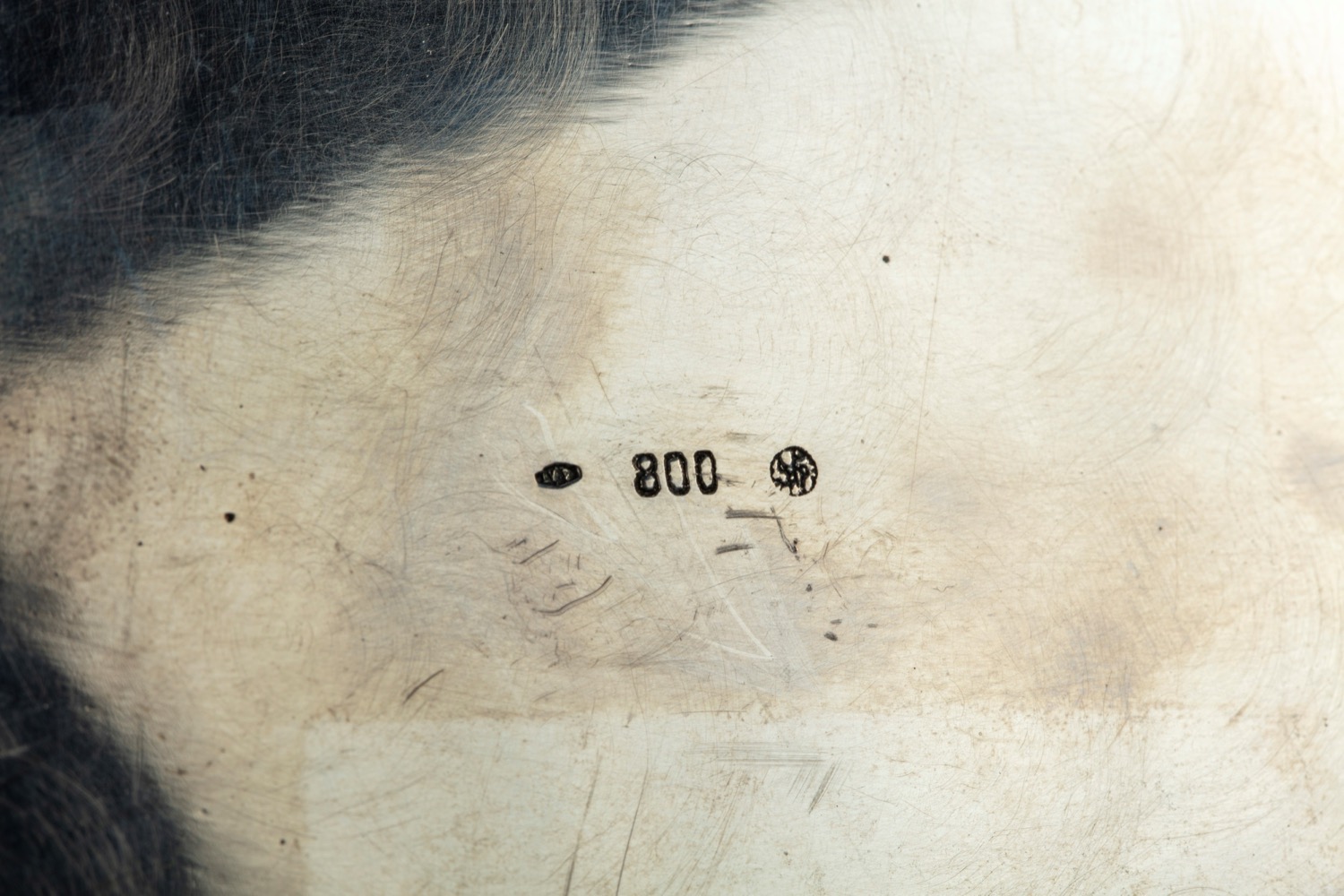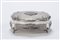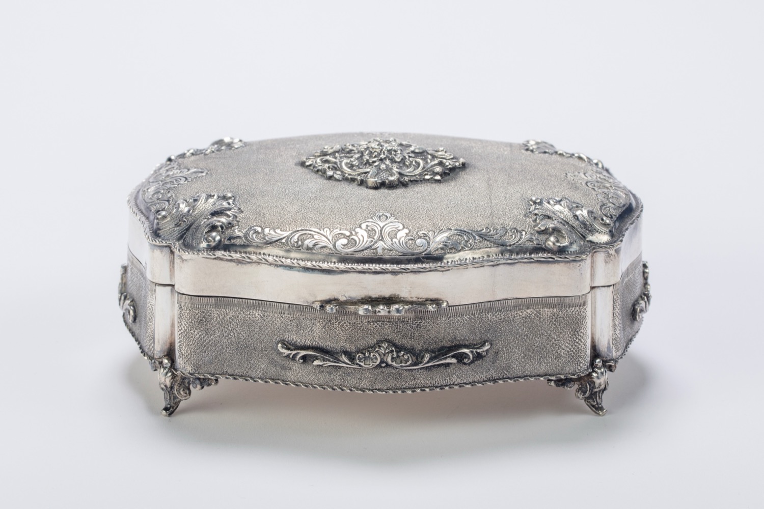 con coperchio, corpo sagomato parzialmente inciso decorato con sbalzi a volute e decoro floreale centrale.