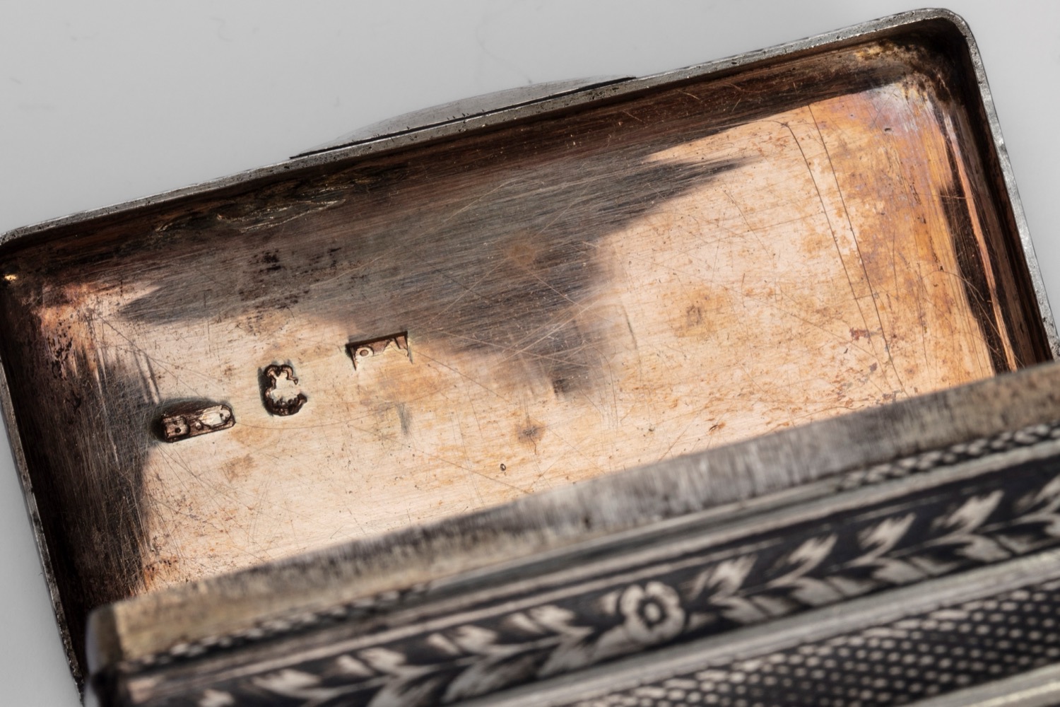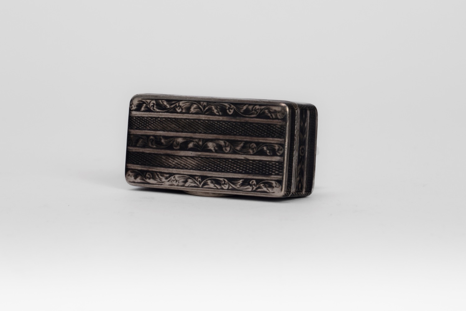 a corpo interamente decorato con niello a fasce alternate tra motivo geometrico e fogliaceo.