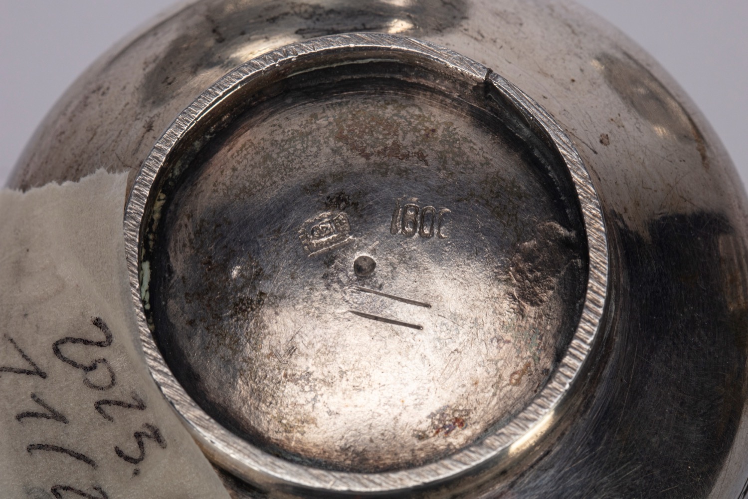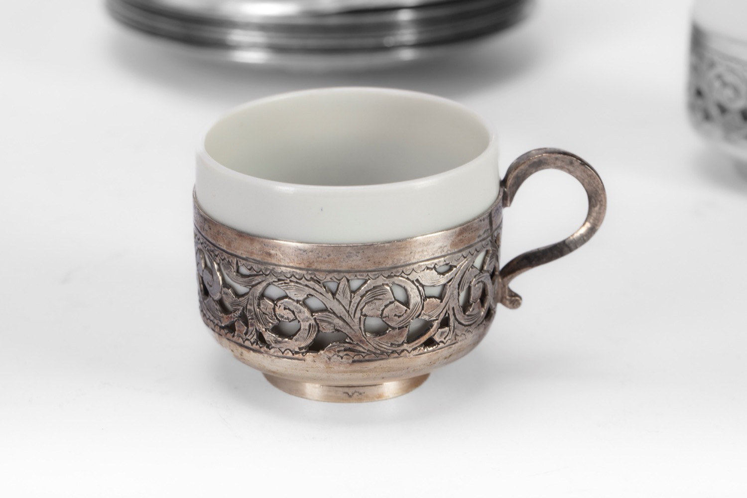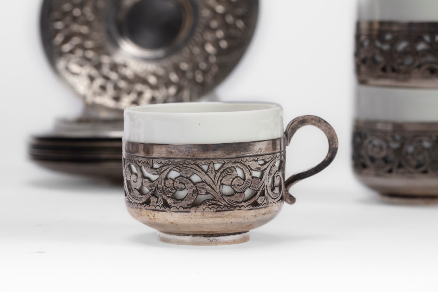 composto da nove tazzine con piattini con bordo traforato e incisioni a volute, parti interne estraibili in ceramica, e due piattini portadolci analoghi. (Difetti).