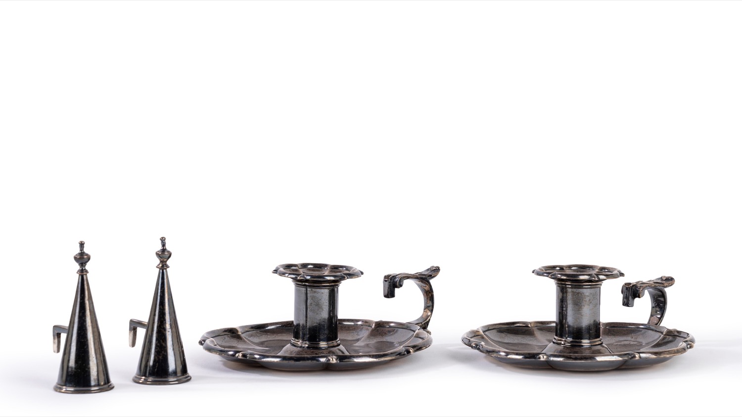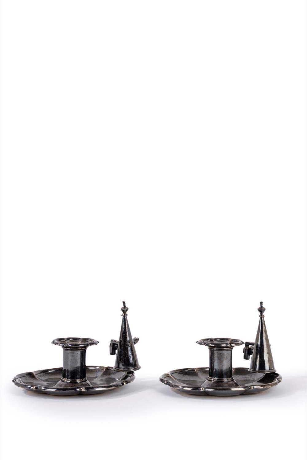 di forma circolare sagomata presa cesellata a foglia stilizzata con annesso accessorio spegni moccolo, al centro reggi candela tornito.
