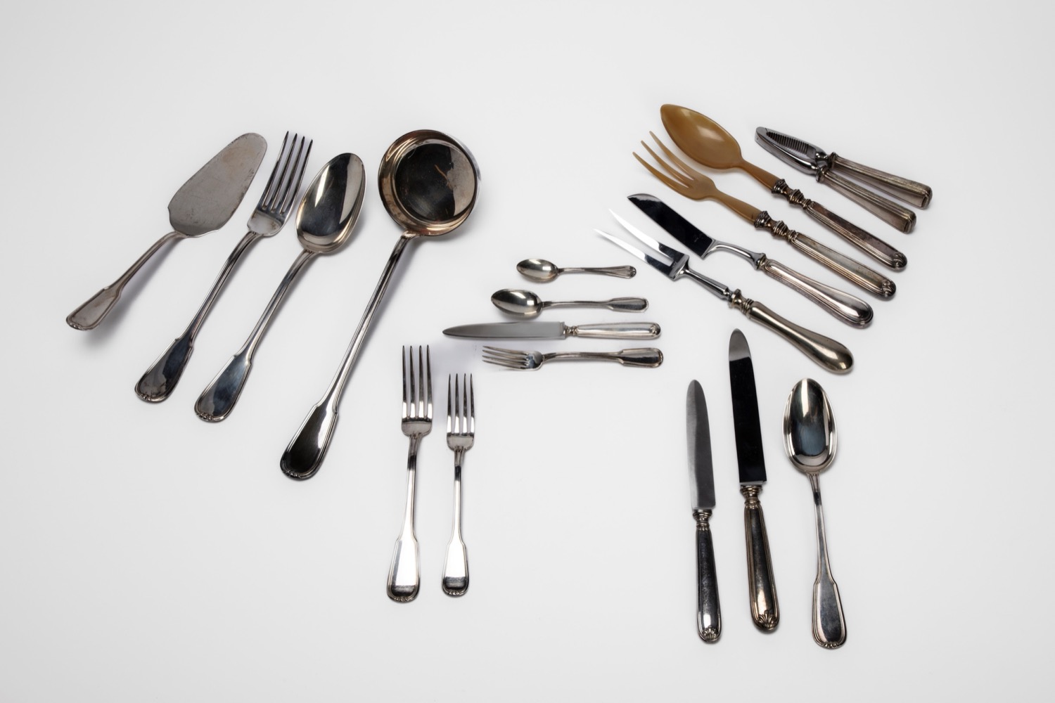 13 cucchiaini da caffè, uno schiaccianoci, un coltello da formaggio, un forchettone di servizio (con manico in simak alpacca, e parte superiore inox), e una coppia di posate da insalata (con manico in argento, parte superiore in simil corno).