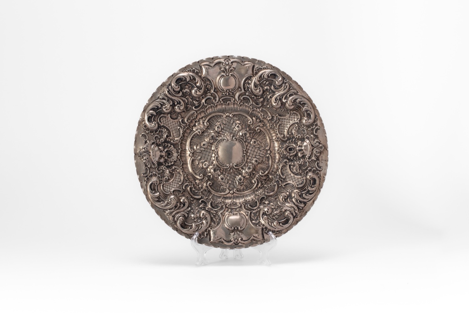 di forma tonda riccamente sbalzato a volute, ghirlande floreali e due mascheroni.