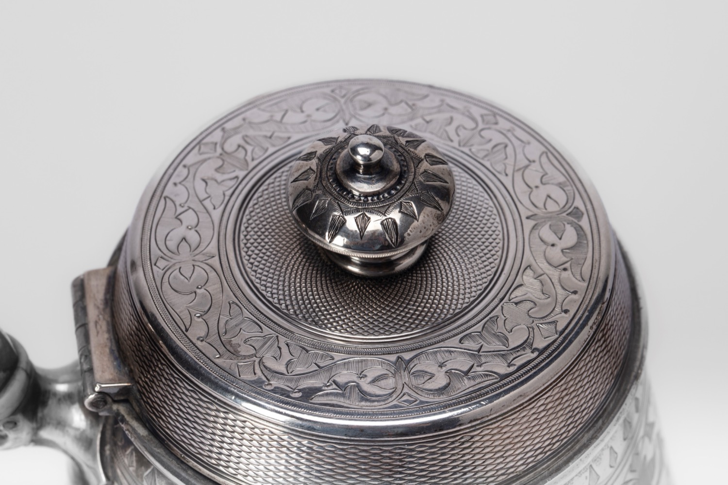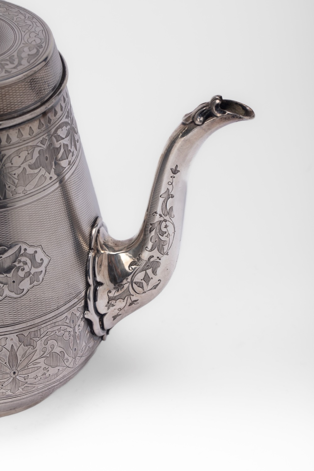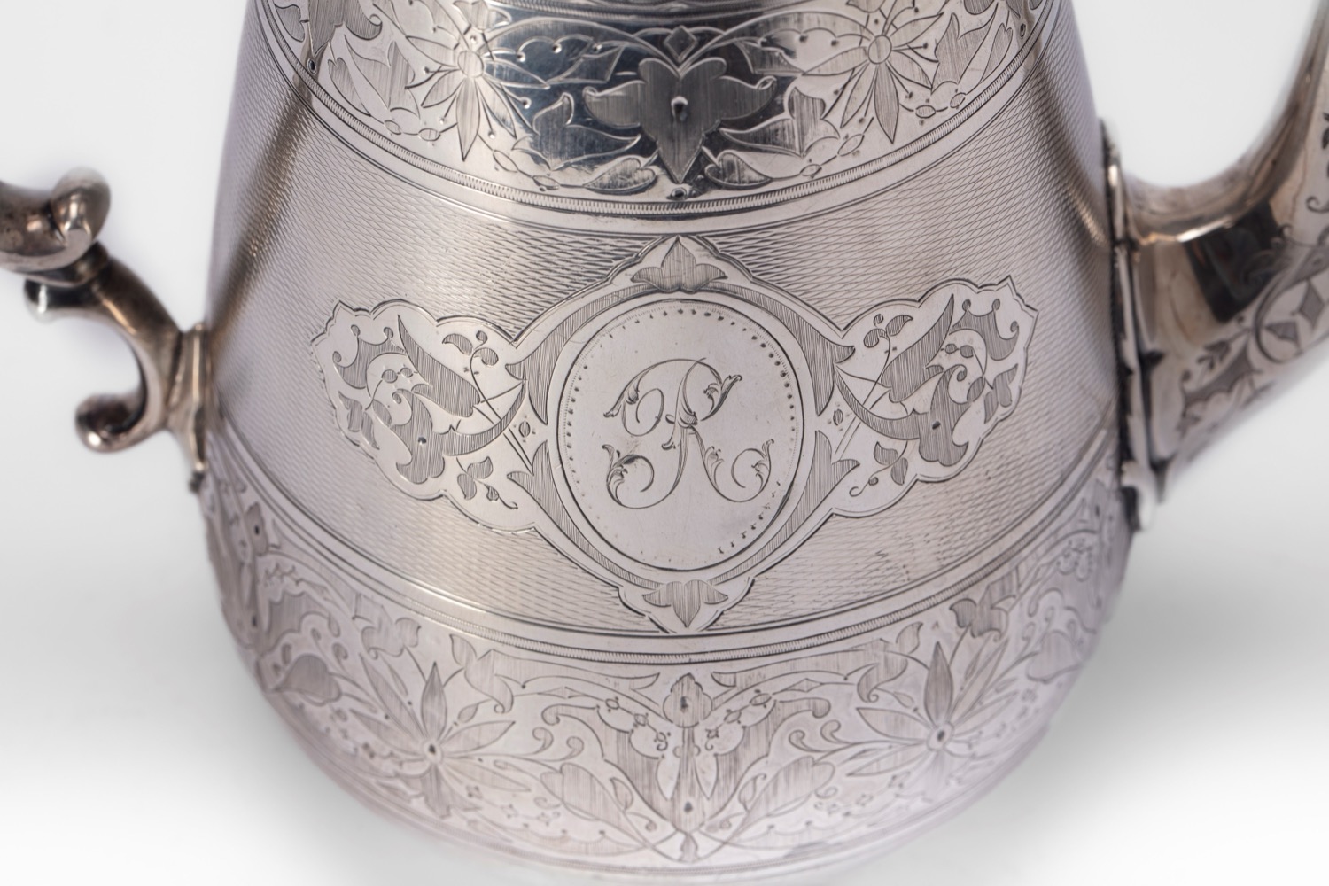 corpo finemente inciso a fasce alternate a motivi geometrici, fiori e volute stilizzate, al centro monogramma, prese e beccuccio mossi. (Lievi difetti).