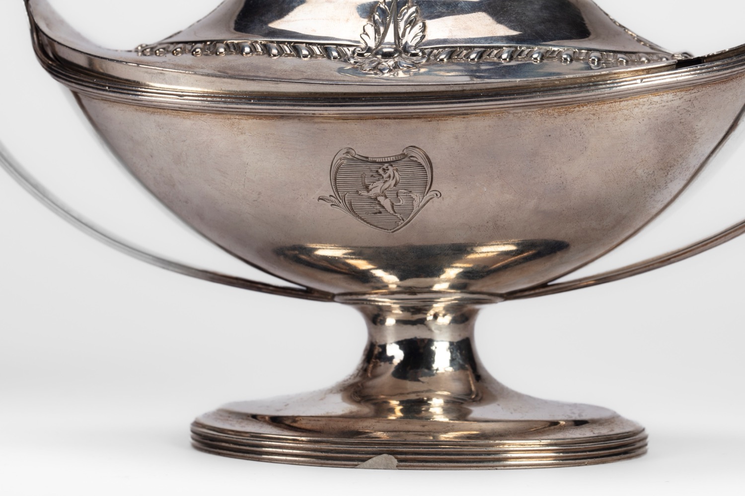 a corpo ovale allungato, coperchi sbalzati a motivi concatenati e foglie, corpo liscio con al centro su entrambi i lati stemma e trionfo araldico con motto.