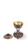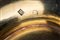 parte superiore con coppa semisferica con interno in vermeil e coperchio ornato da una scultura di pappagallo posata su un ramo, realizzata a tutto tondo, parte inferiore a base tripode ornata da mascheroni cesellati poggiante su ulteriore base tonda con ringhierina traforata, punzoni di garanzia e punzone dell’argentiere non identificato AEG.