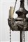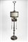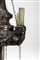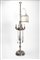 porta candele sbalzato a festoni volute e nastri con porta luci mossi e sbalzati a volti di satiri, munito di accessori con catenelle, fusto centrale in ottone argentato, base riccamente tornita a vasi stilizzati poggiante su piede tondo cesellato a foglie d'acanto, paralume sporgente di forma curva con cornice cesellata a fiori stilizzati e mascherone centrale. (Lievi difetti).