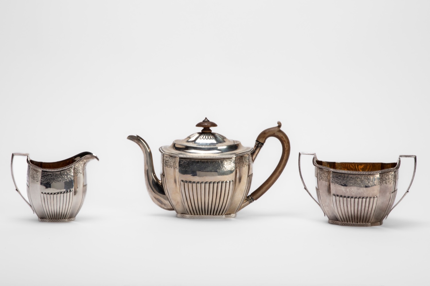 composto da teiera con manico in legno, zuccheriera e lattiera con interno in vermeille, a corpo parzialmente costolato, fascia superiore incisa a ghirlanda floreale.
