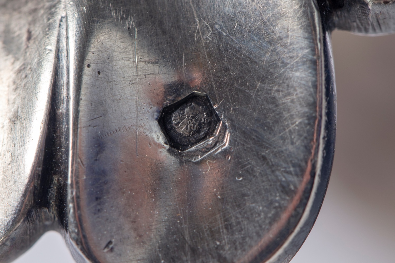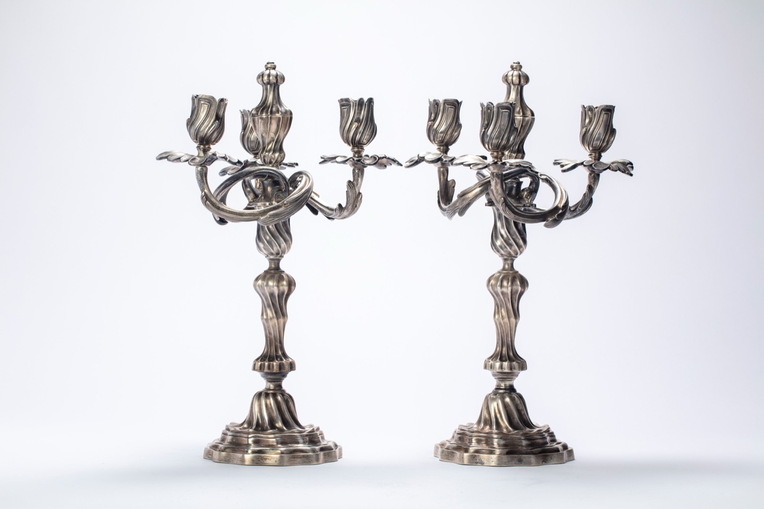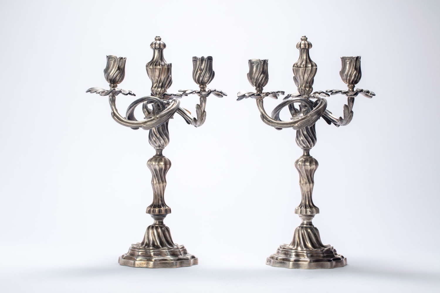 corpo a torciglione scanalato terminante a tre braccia ricurve decorate a foglie stilizzate, parte centrale con pinnacolo tornito e spegni moccolo estraibile.