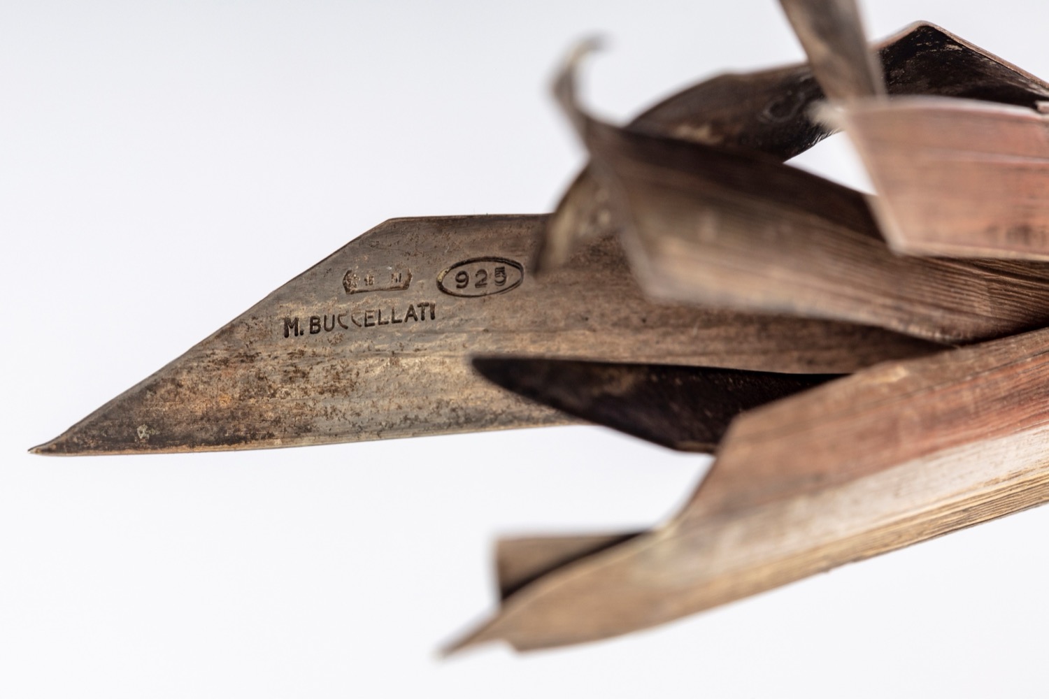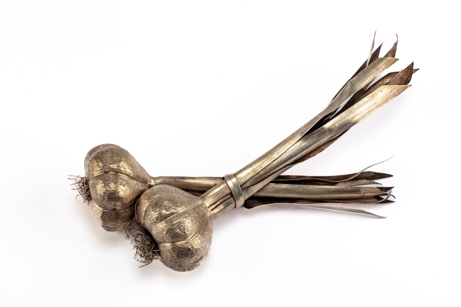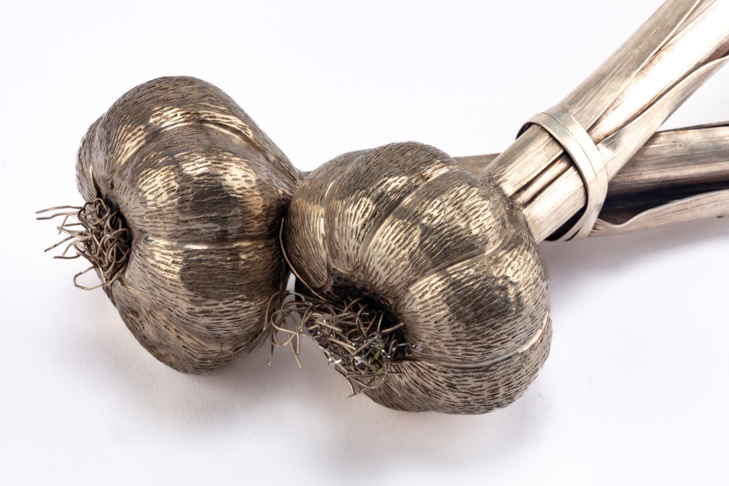 a foggia di due teste d’aglio, finemente sbalzate ed incise in maniera realistica con foglie riunite al centro da nastro stilizzato, punzoni all’interno di una foglia, M.Buccellati, 925, 15MI.