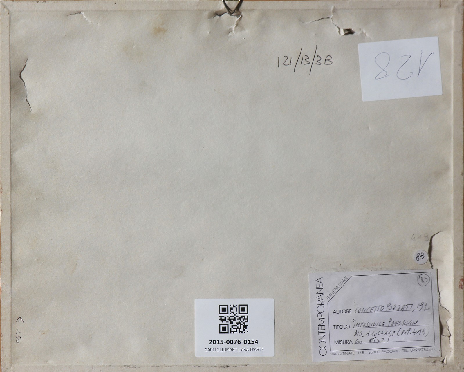 POZZATI CONCETTO (n. 1935) Impossible paesaggio. Collage. Cm 21,00 x 15,00. Firma e anno in basso. Al retro cartiglio descrittivo a cura della Galleria d'Arte Contemporanea, Padova. Cornice presente