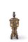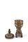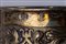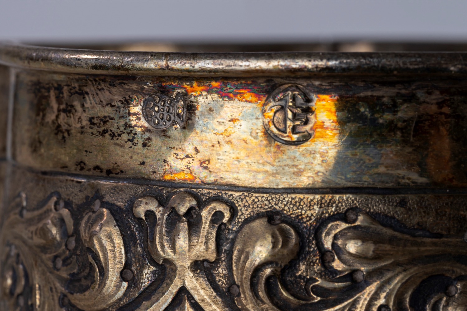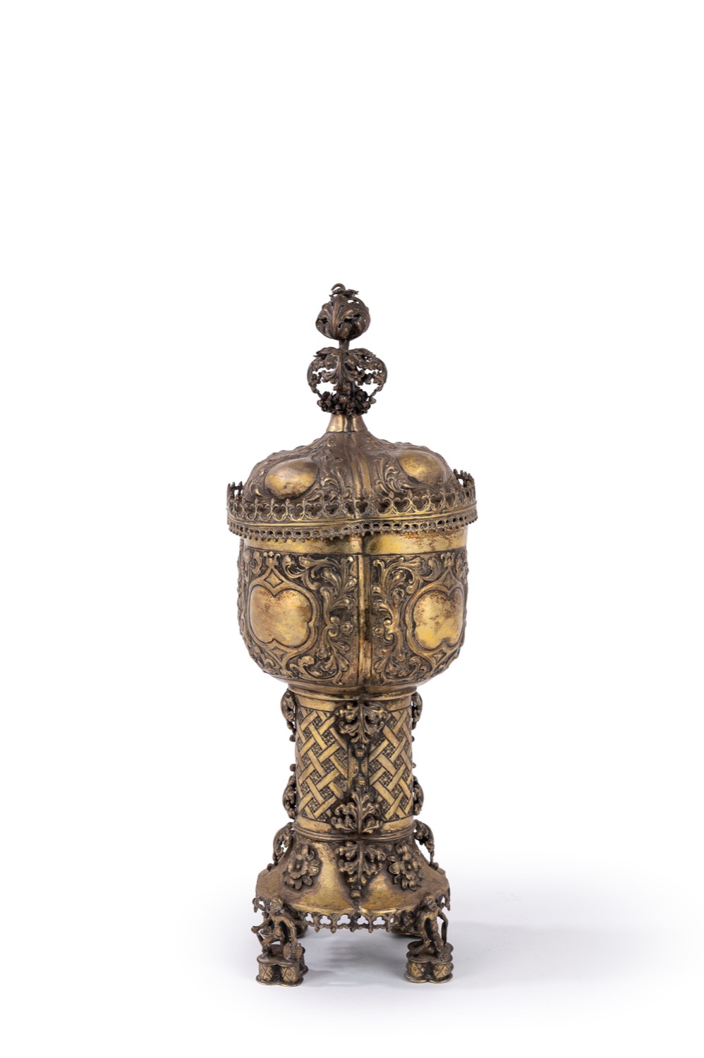 parte superiore con coperchio decorato con pinnacolo centrale a corpo sbalzato a bugnature e motivi fogliacei, parte centrale con decoro geometrico intrecciato, base sorretta da quattro figurine cesellate a tutto tondo, bolli di imitazione seicentesca alla base.