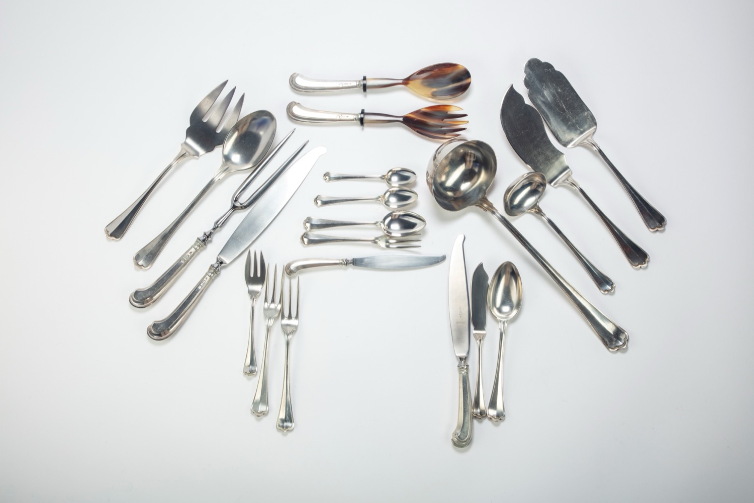 12 coltelli, 24 forchette, 12 cucchiai, 12 coltelli da pesce, 12 forchette da pesce, 12 forchette da frutta, 12 cucchiai da frutta, 12 coltelli da frutta, 12 cucchiai da dolce, 11 cucchiaini da caffé, 2 posate da insalata con parte terminale in corno, 1 coltello e 1 forchettone da arrosto, 1 mestolo, 2 cucchiai da servizio, 1 forchetta e 2 palette da dolce.