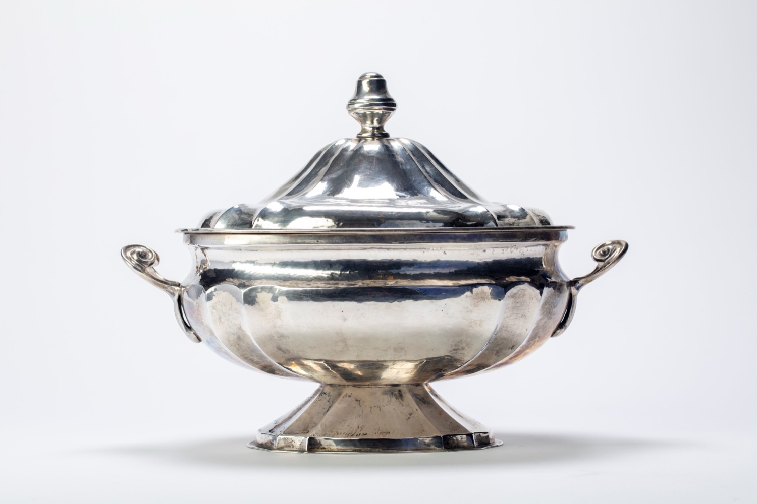 corpo martellato e sbalzato, coperchio con pomolo tornito, prese laterali cesellate.