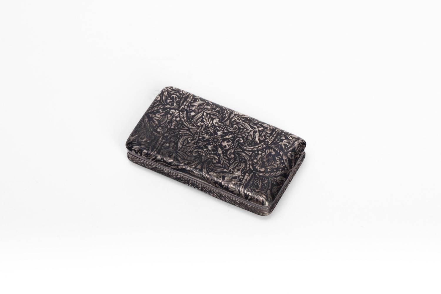 con decoro niellato su tutto il corpo a motivi fogliacei, basi e figura orientale stilizzata.
