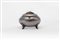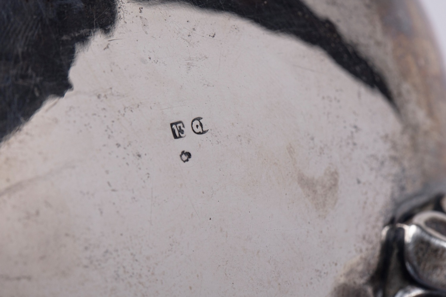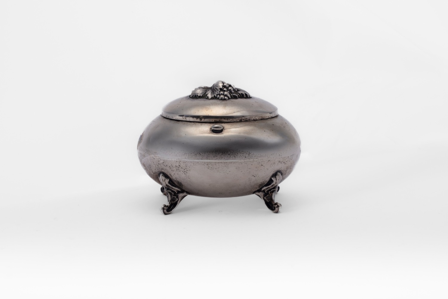 corpo ovoidale liscio sorretto da quattro piedini cesellati a foglie e ricciolo, presa del coperchio decorata a sbalzo a frutti e foglie.