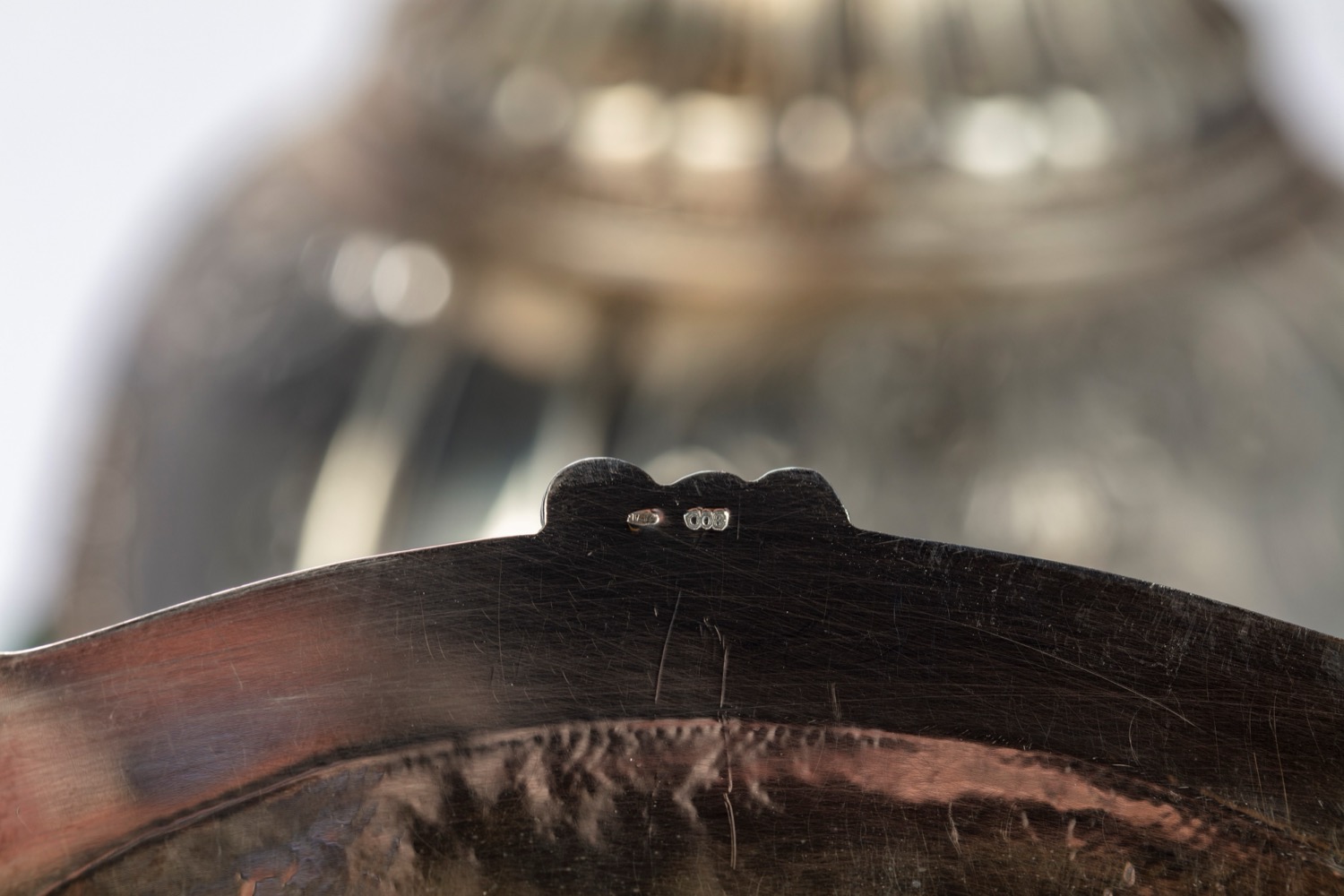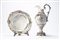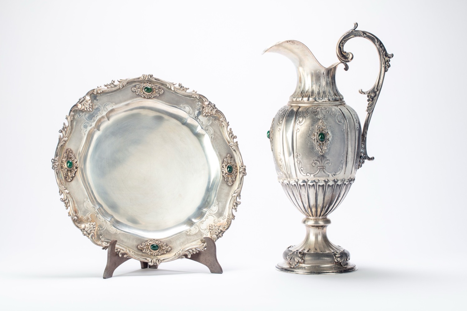 a parti alternate con decorazioni incise, bordo del piatto cesellato a volute, brocca con presa sagomata, decorazioni con pietre dure taglio cabochon applicate.