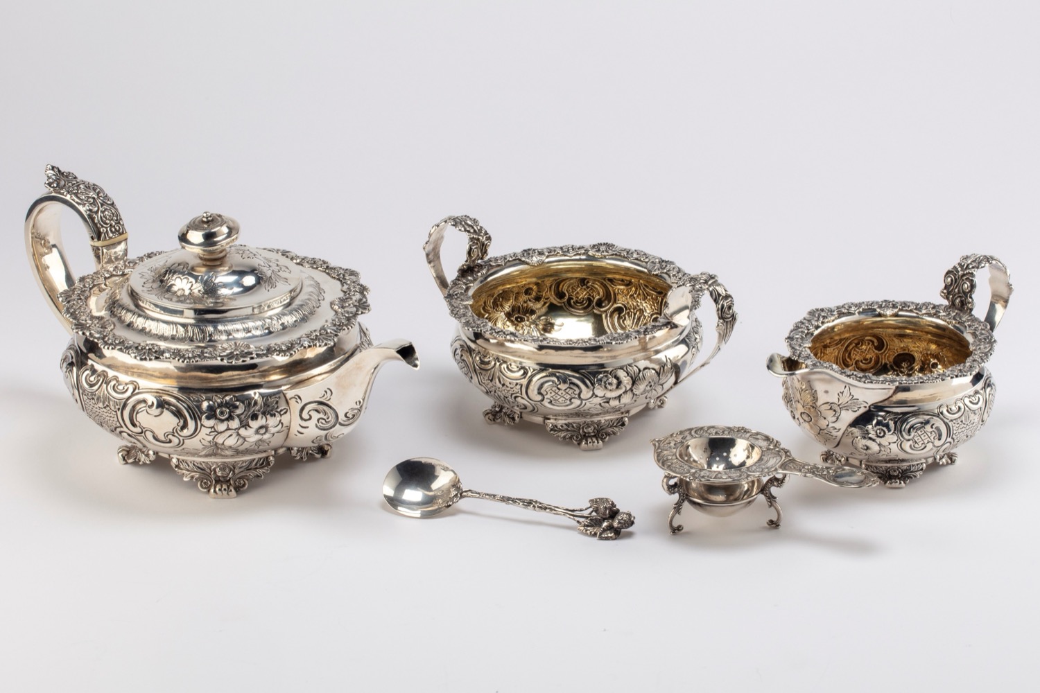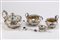 composto da teiera, zuccheriera, lattiera, colino da tè e cucchiaino, a corpo sbalzato a volute, prese torse.