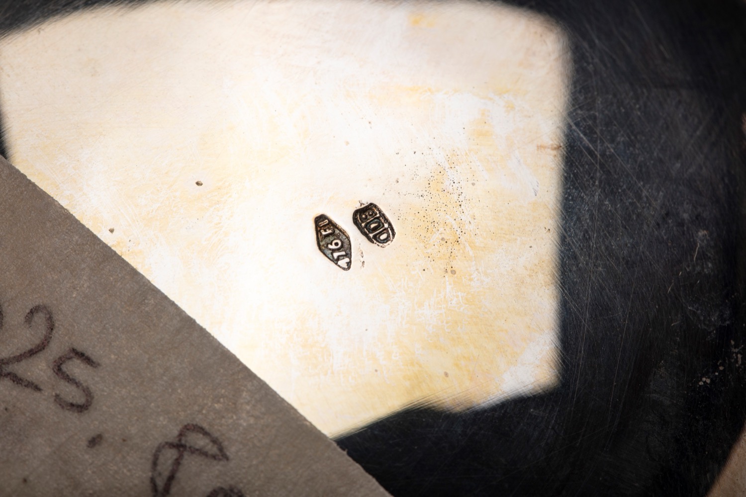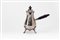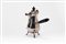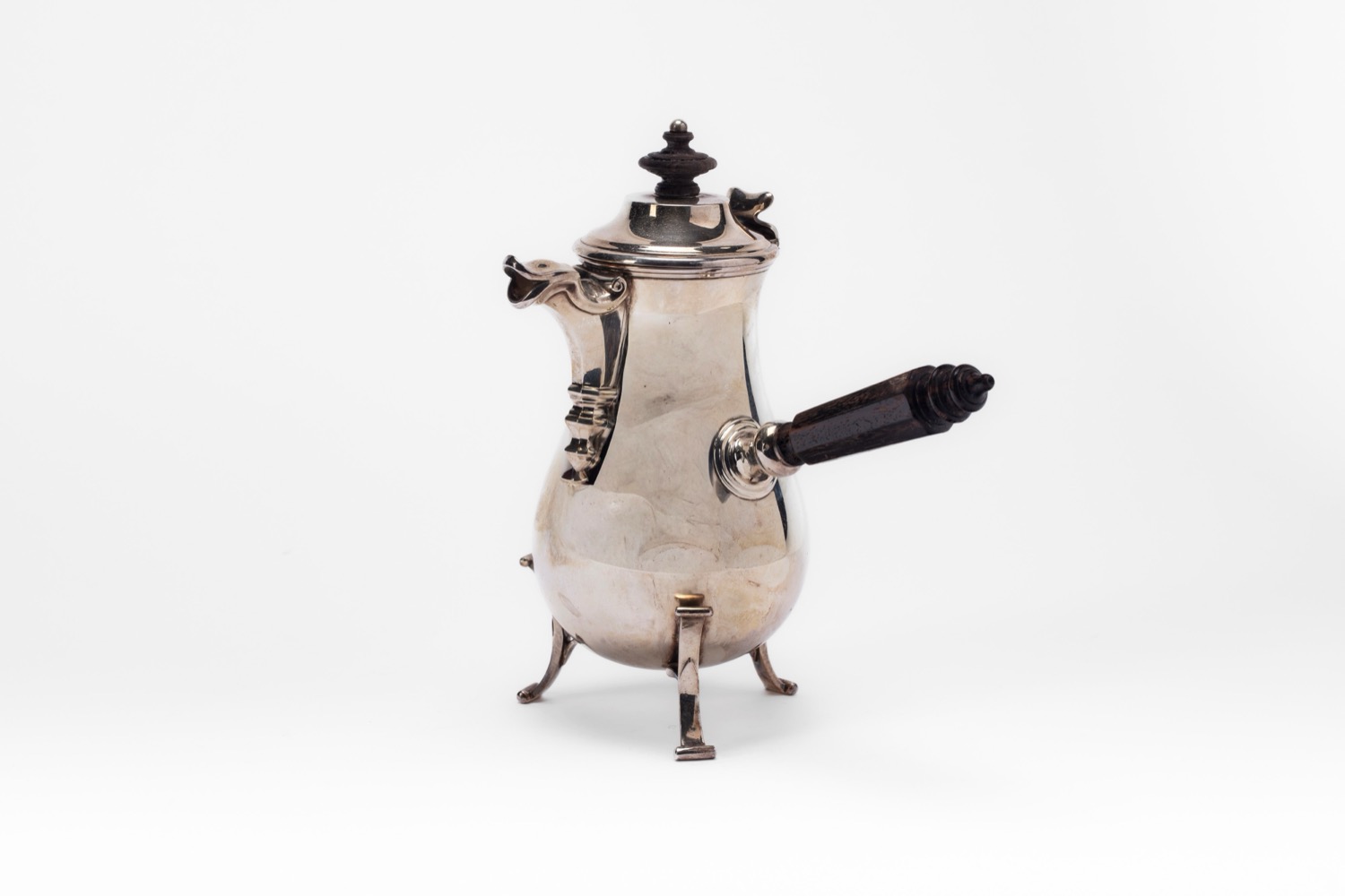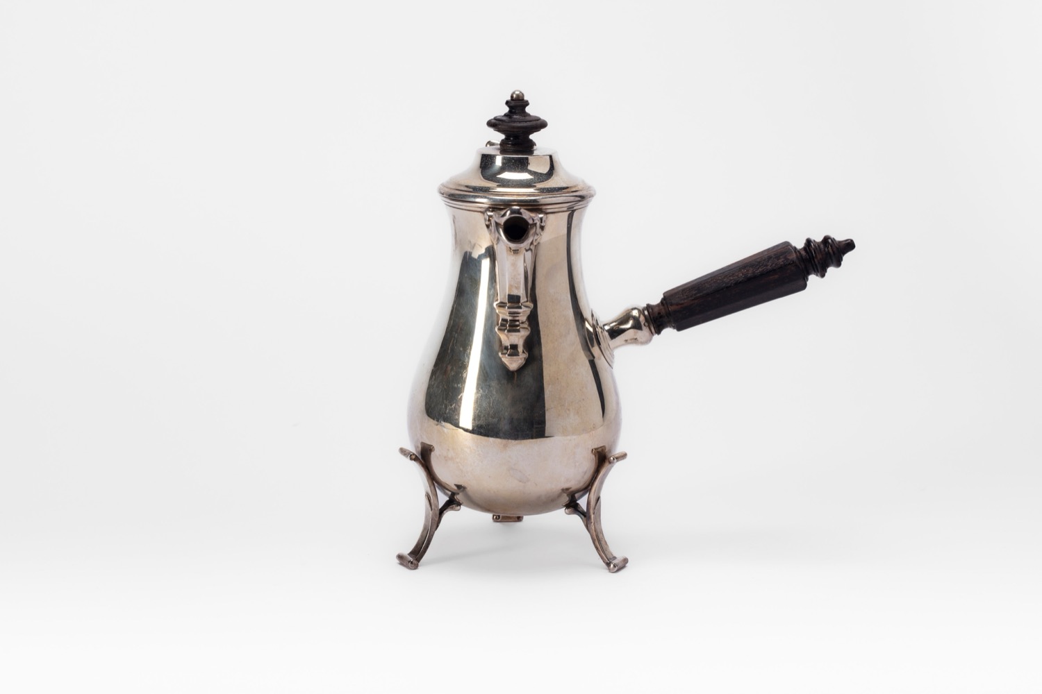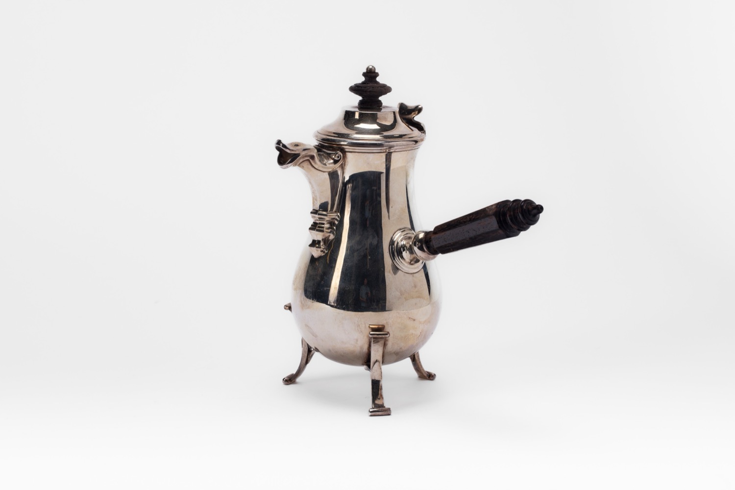 corpo piriforme liscio sorretto da tre gambe sagomate, presa laterale in legno sfaccettato.