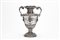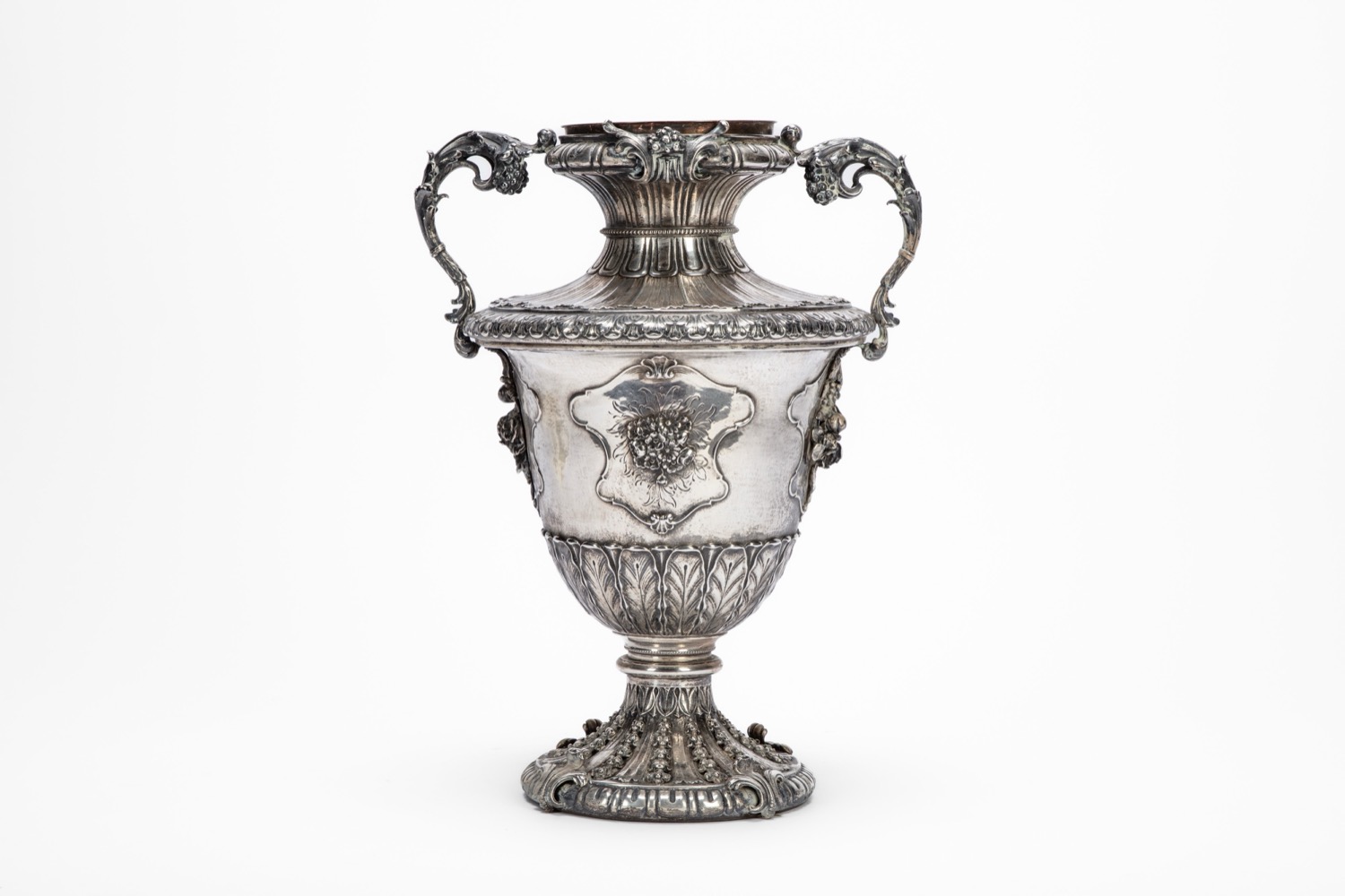 due anse cesellate a volute con uva stilizzata. Corpo sbalzato a foglie d'acanto e trionfo floreale al centro incorniciato da profilo sagomato. Base tornita con bordatura dentellata e applicazioni a foglie.