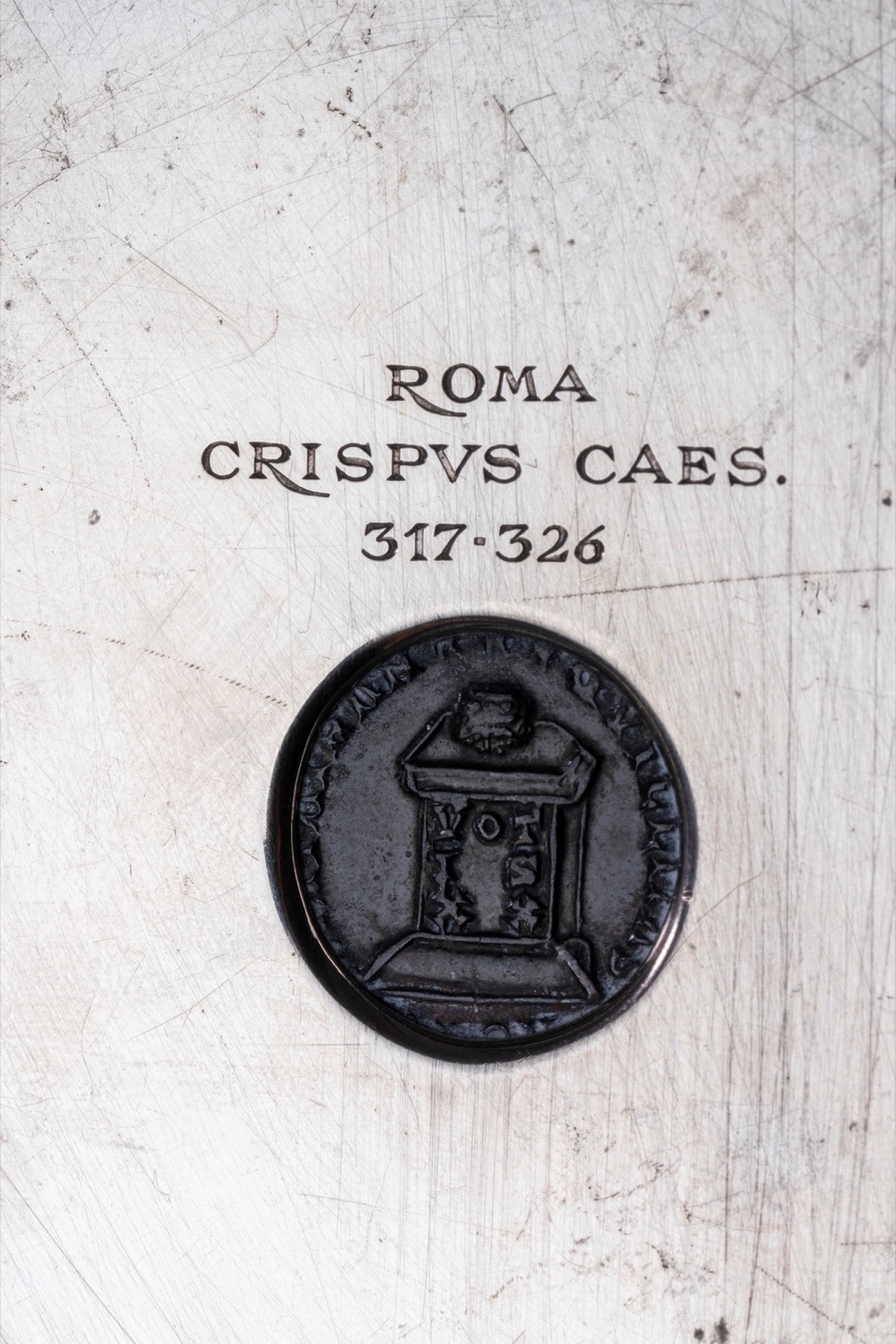 con bordo frastagliato, al centro incastonata moneta CRISPUS CAESAR, punzonato alla base BULGARI, 925.
