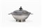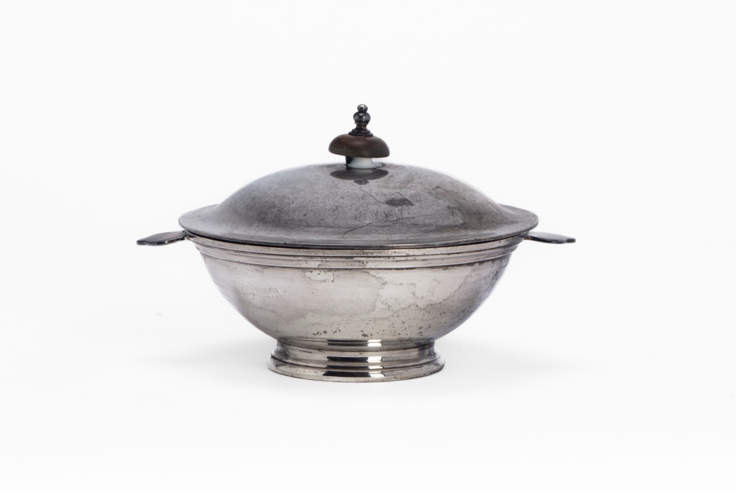 di forma tonda a corpo liscio con prese sagomate laterali, pomolo del coperchio in legno tornito.