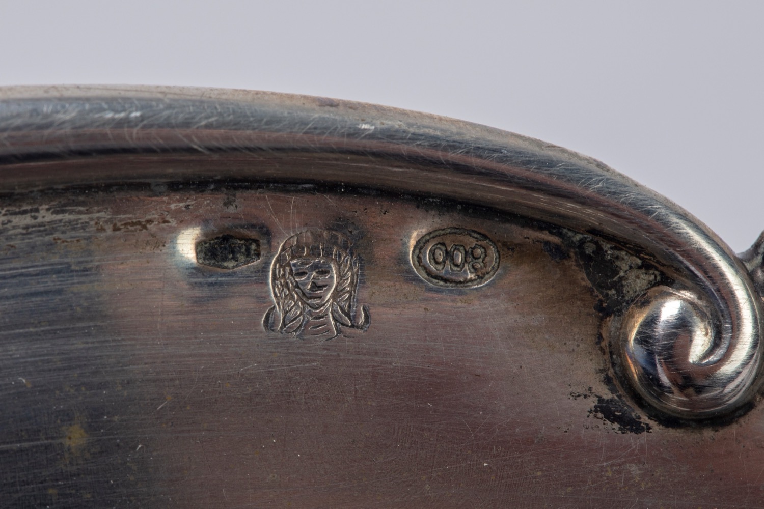 con bordo sagomato, decorata con motivi vegetali, sorretta da tre piedini sagomati.