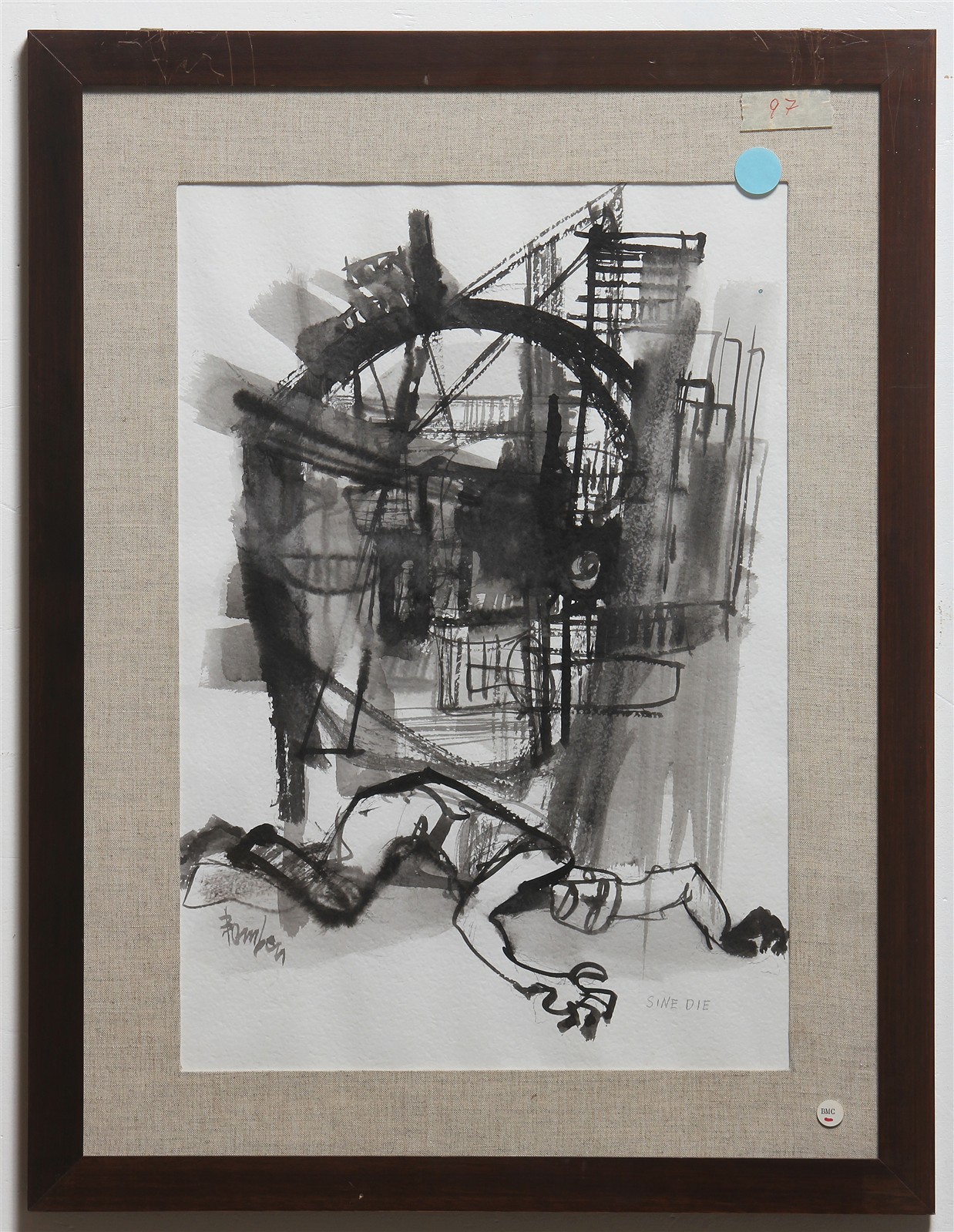 BOMBEN OTTAVIO (1925 - 2006) Sine Die. Gouache su carta. Cm 48,00 x 33,00. Firma in basso a sinistra, titolo in basso a destra. Cornice presente