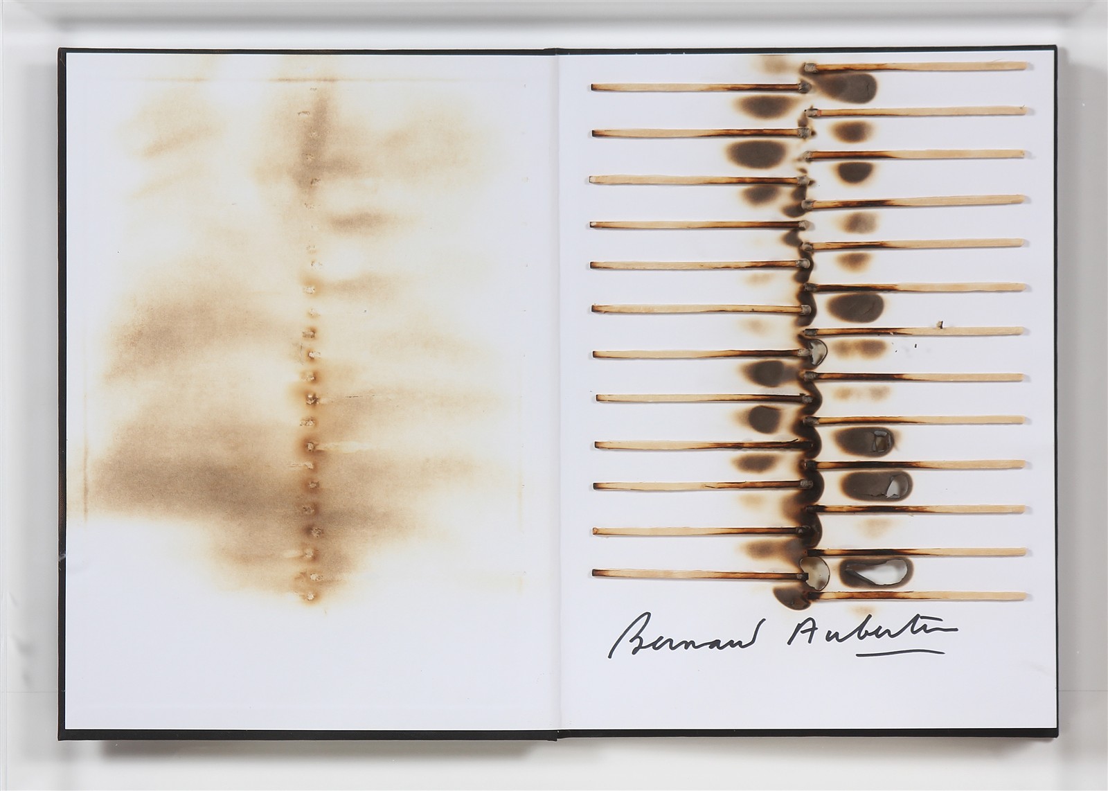 AUBERTIN BERNARD (n. 1934) Il fuoco e il rosso. Fiammiferi su cartone. Cm 50,00 x 37,00. Firma in basso a destra. Autentica dell' artista su fotografia.Entro teca di Plexi. Cornice presente