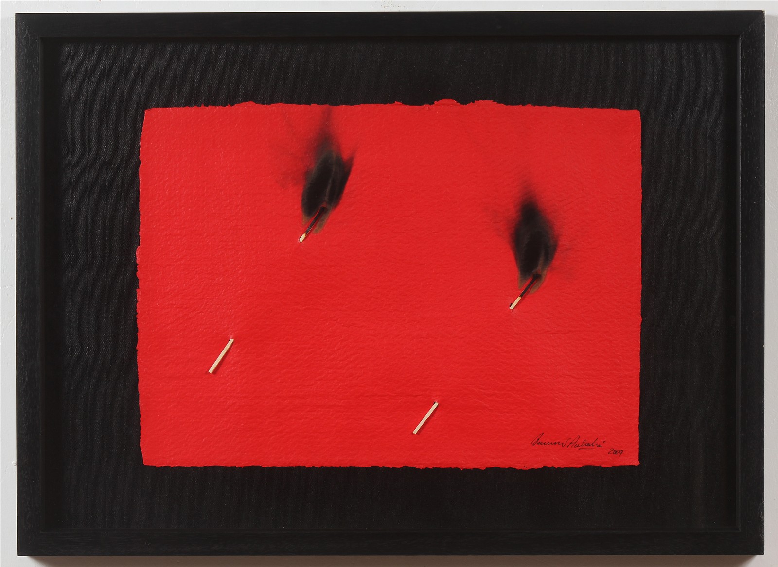 AUBERTIN BERNARD (n. 1934) Senza titolo. 2009. Fiammiferi su cartone. Cm 36,00 x 50,00. Firma e anno in basso a destra, Opera archiviata presso l' archivio Nordest srl, Seregno come da documentazione fotografica allegata all' opera riportante il relativo numero di inventario. Opera pubblicata sul volume (allegato all'opera) Bernard Aubertin, Dessins de feu sur papier, Piazza Dante editore. Cornice presente