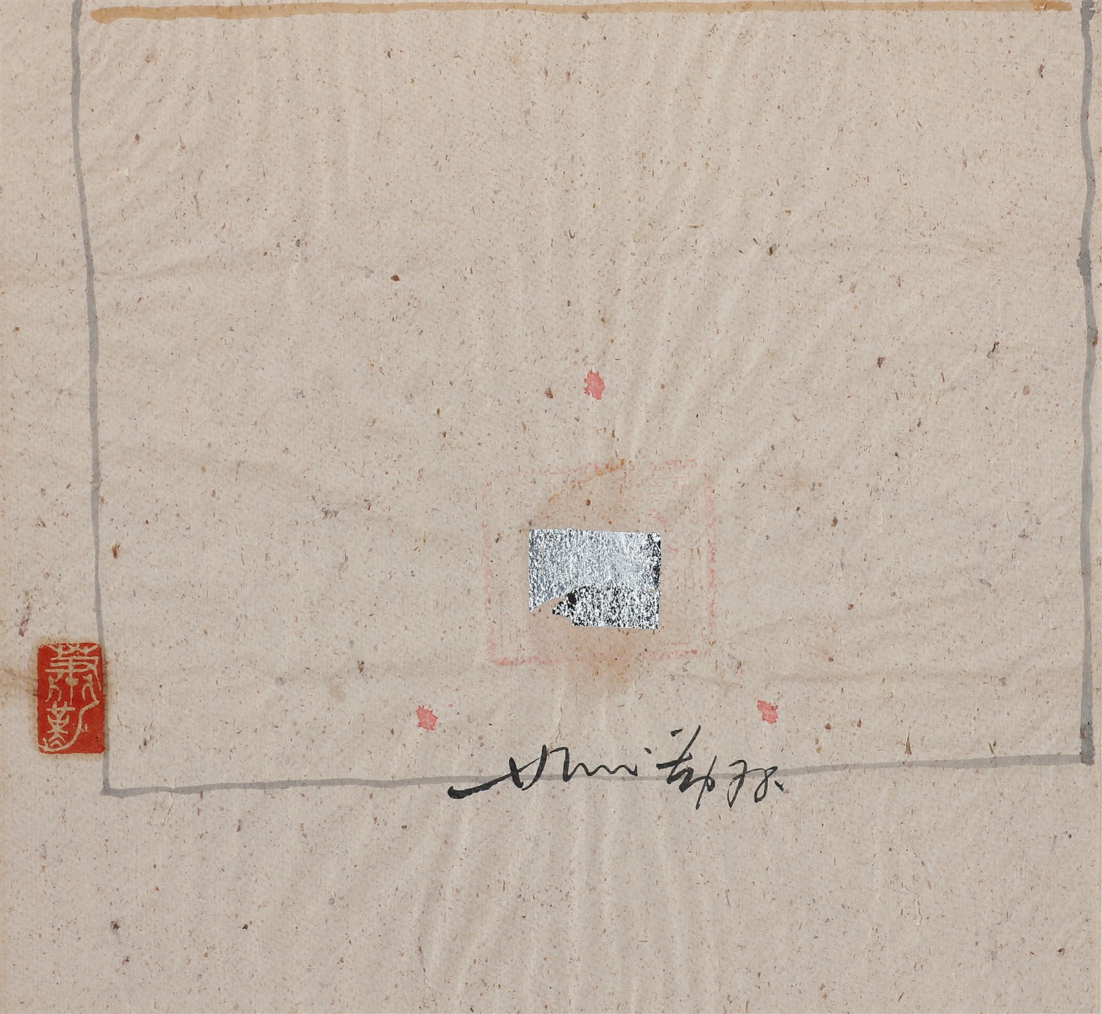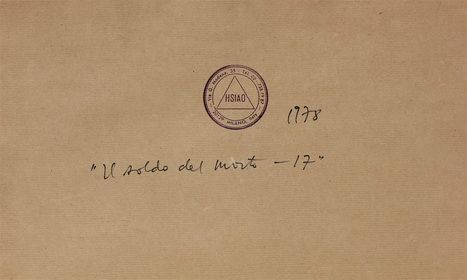 CHIN HSIAO (n. 1935) Il soldo del morto 17. Tecnica mista su carta. Cm 36,00 x 33,00. Firmato in basso al centro. Al retro su foglio di carta da pacco coeva all'originale timbro "HSIAO Via modena 35 - 20129 - Milano" e titolo. Autentica dell'artista su fotografia. Cornice presente