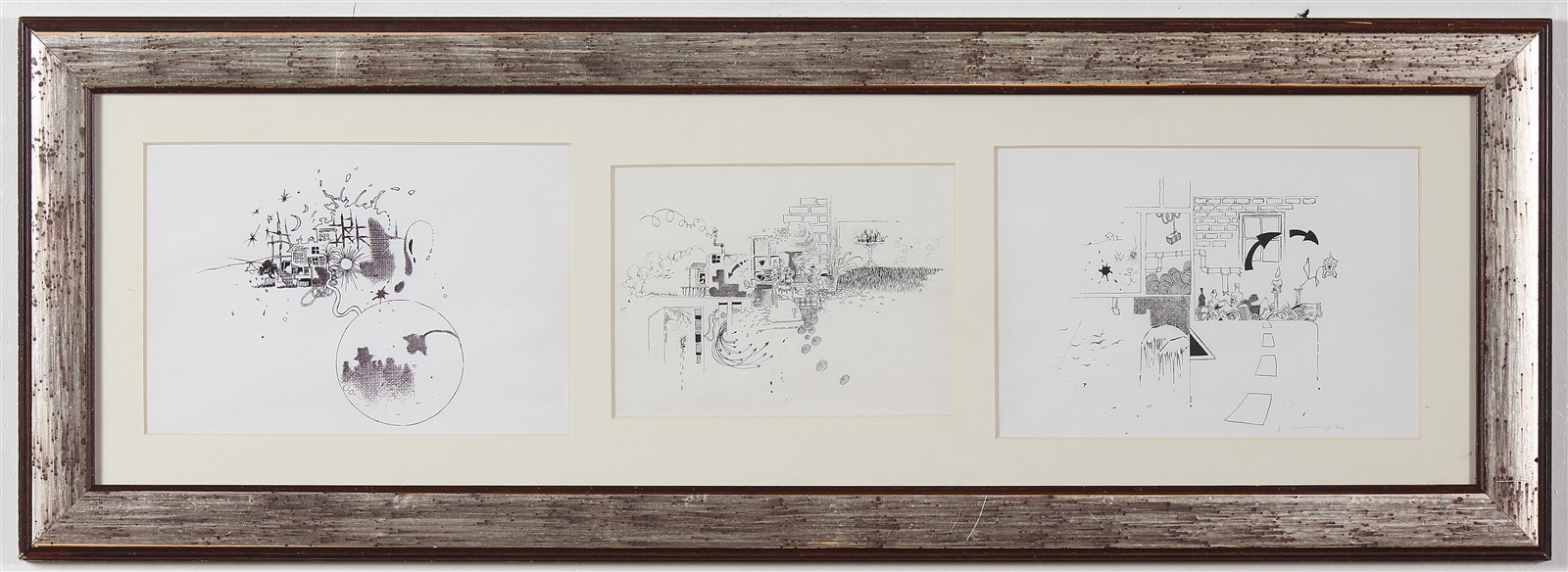 FERRONI GIANFRANCO (1927 - 2001) Lotto composto da n. 3 disegni. China su carta. Cm 90,00 x 29,00. I tre disegni sono incorniciati insieme. Tutti e tre i disegni presentano l'Autentica a cura di Studio d'Arte Mutinese srl, Modena. Solo l'ultimo disegno presenta la firma dell'autore. Cornice presente