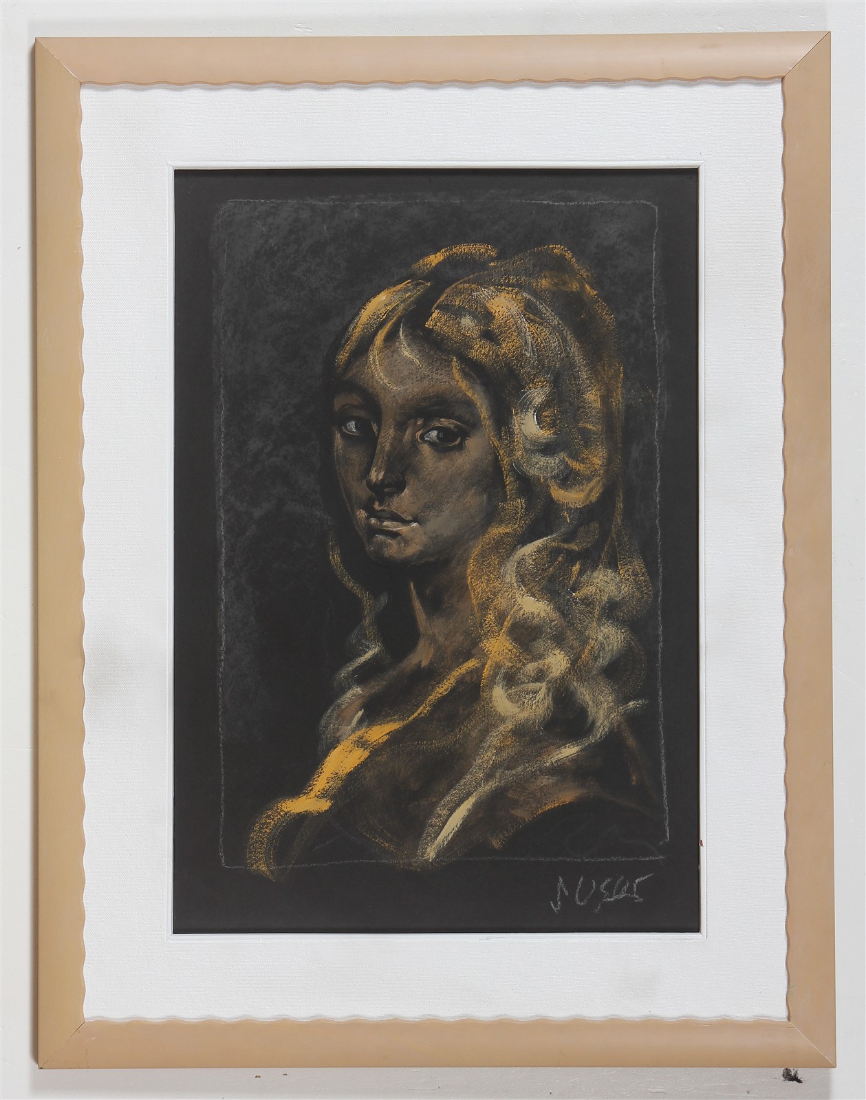 SUGHI ALBERTO (n. 1928) Ritratto di ragazza. Tecnica mista su carta. Cm 35,00 x 50,00. Firma in basso a destra. Autentica dell' artista su fotografia.