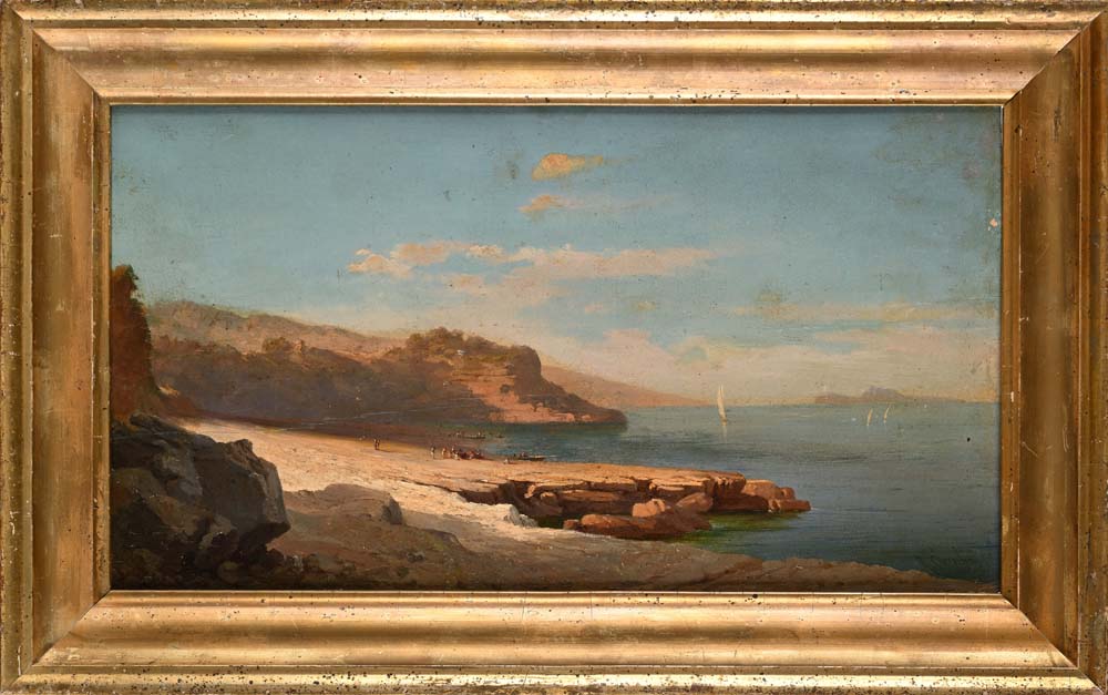 Veduta costiera con l’isola di Capri sullo sfondo firmato in basso a destra a. cherubini olio su legno cm 25 x 44,5 – in cornice cm 33,5 x 53,5