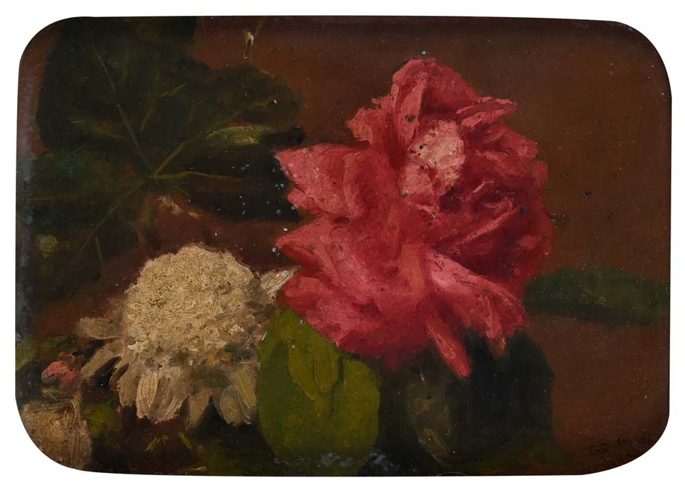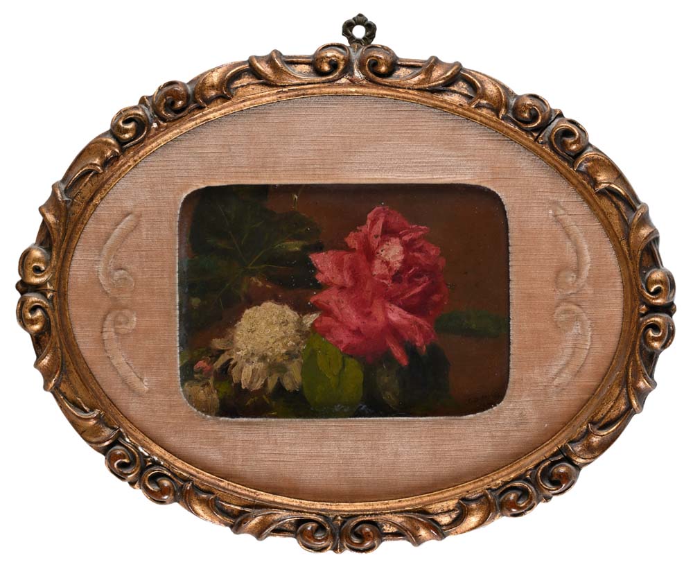 Natura morta di fiori e foglia firmato in basso a destra DAL VERO / C. Pennacchietti olio su tela cm 16,5 x 23 – in cornice cm 35 x 47