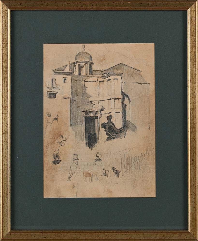b) Facciata di Chiesa e studio di personaggi