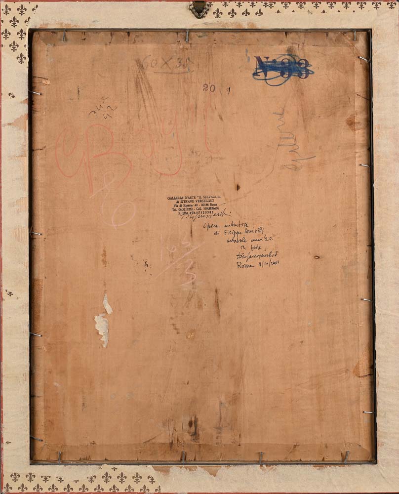 Sul retro dichiarazione di autenticità e timbro in data 8/10/2001. olio su legno cm 42,5 x 34 - in cornice cm 48,5 x 40 Galleria d'arte Il Selvaggio, Roma