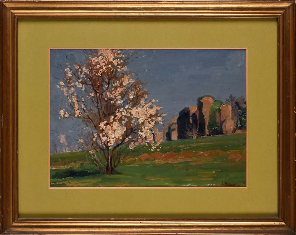 Roma, Ciliegio in fiore presso le mura aureliane firmato in basso a destra L. Petrassi olio su cartone cm 27 x 37,5 – in cornice c, 42 x 52