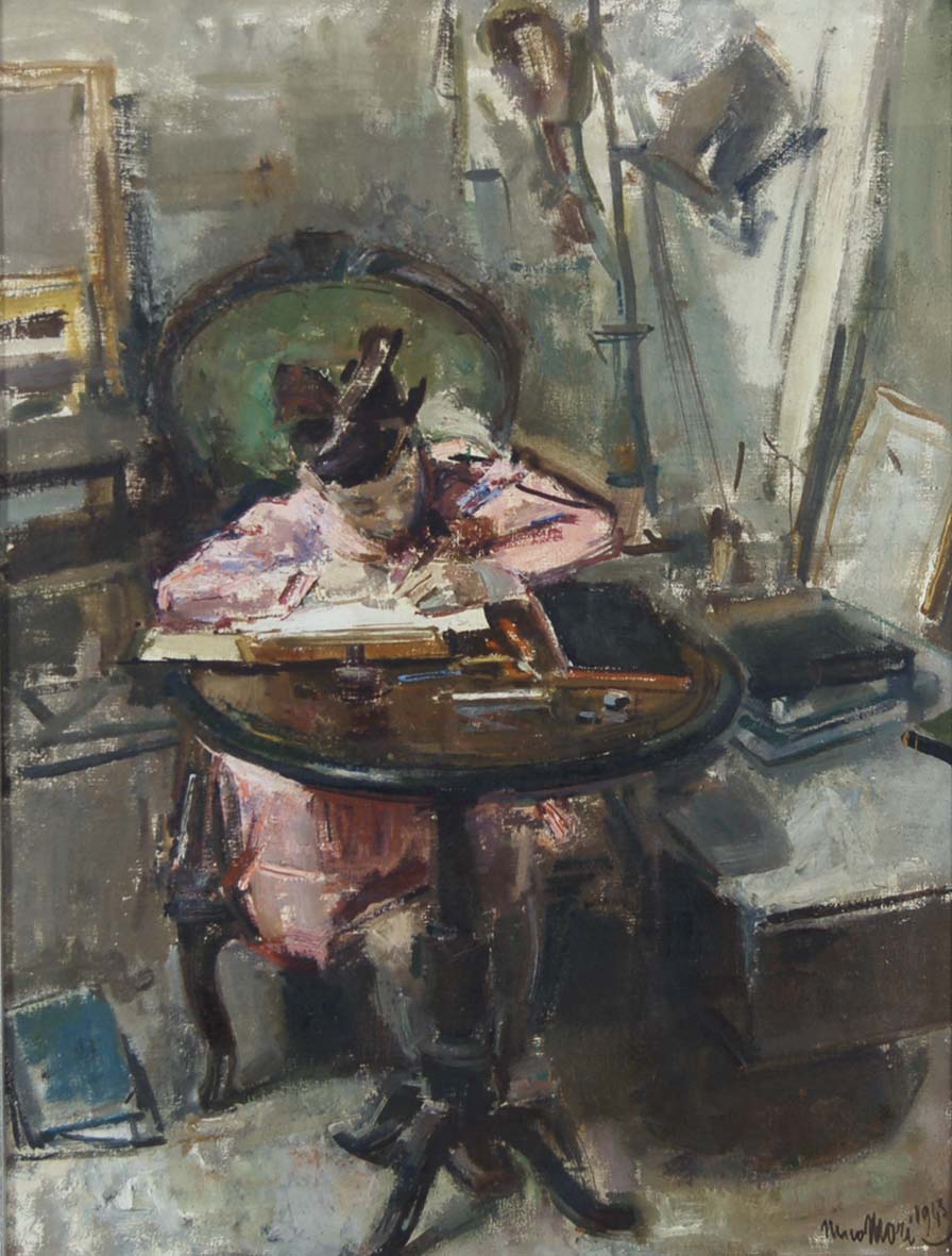 MORI NENO Venezia 1899 - 1968 Mia figlia che studia 1943 olio su tela 69x52 cm firma e data in basso a destra etichetta dell'Autore al retro