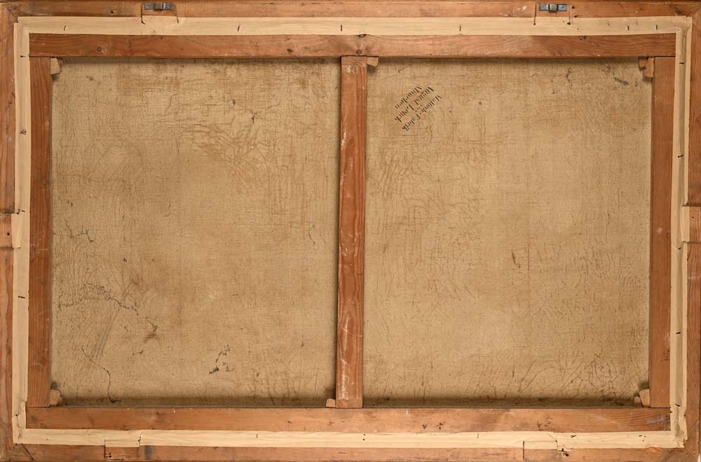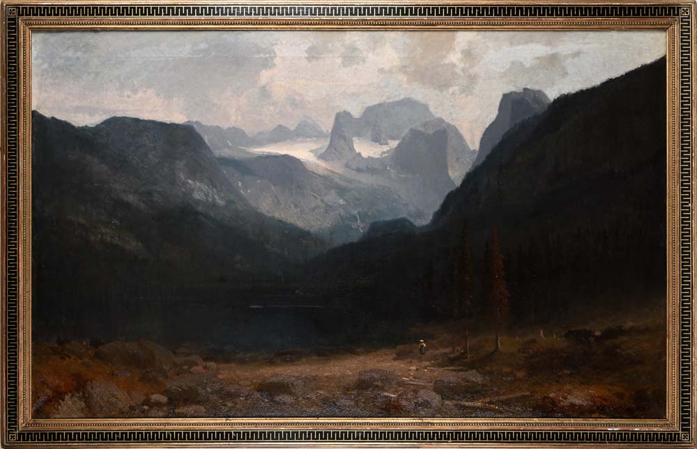 Lago e valle in alta montagna 1873 firmato e datato in basso a destra J Winkler 73 olio su tela cm 97 x 150 – in corncie cm 85,5 x 138,5
