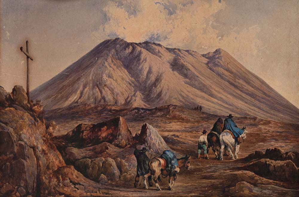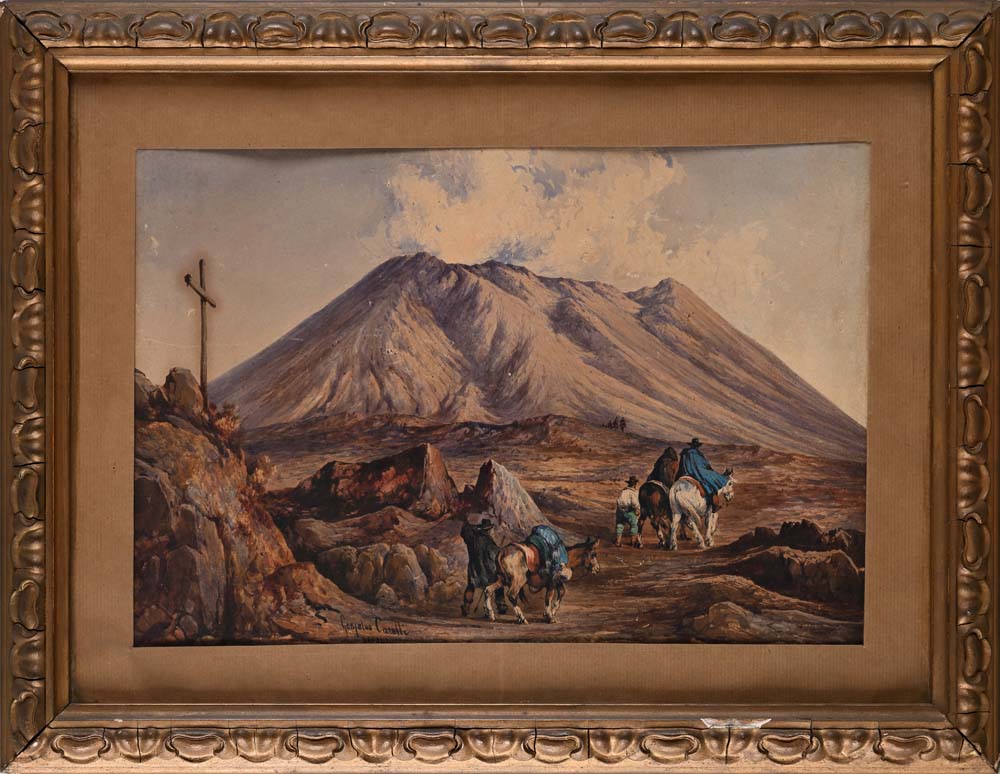 La salita al Vesuvio firmato in basso verso sinistra Gonsalvo Carelli / NAPOLI acquerello su cartoncino cm 27,5 x 39 – in cornice cm 40 x 52