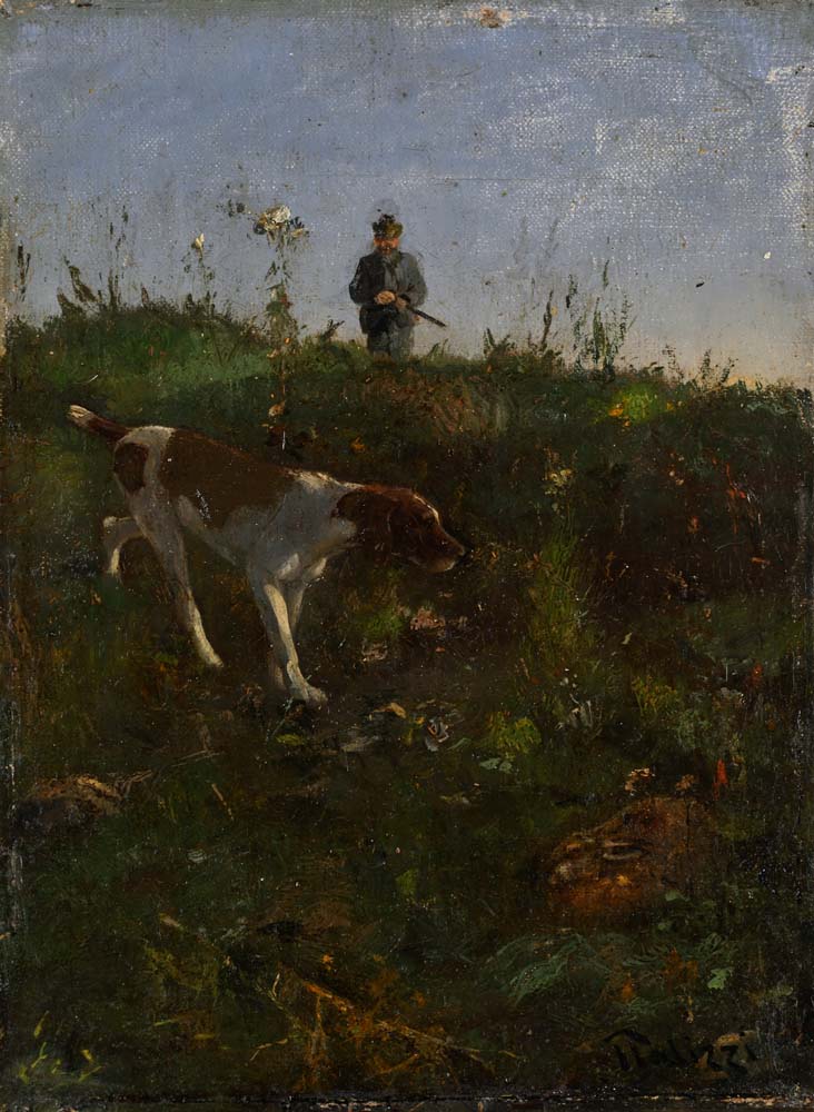 Giuseppe Palizzi (Lanciano 1812 - Parigi 1888) Cacciatore e cane firmato in...