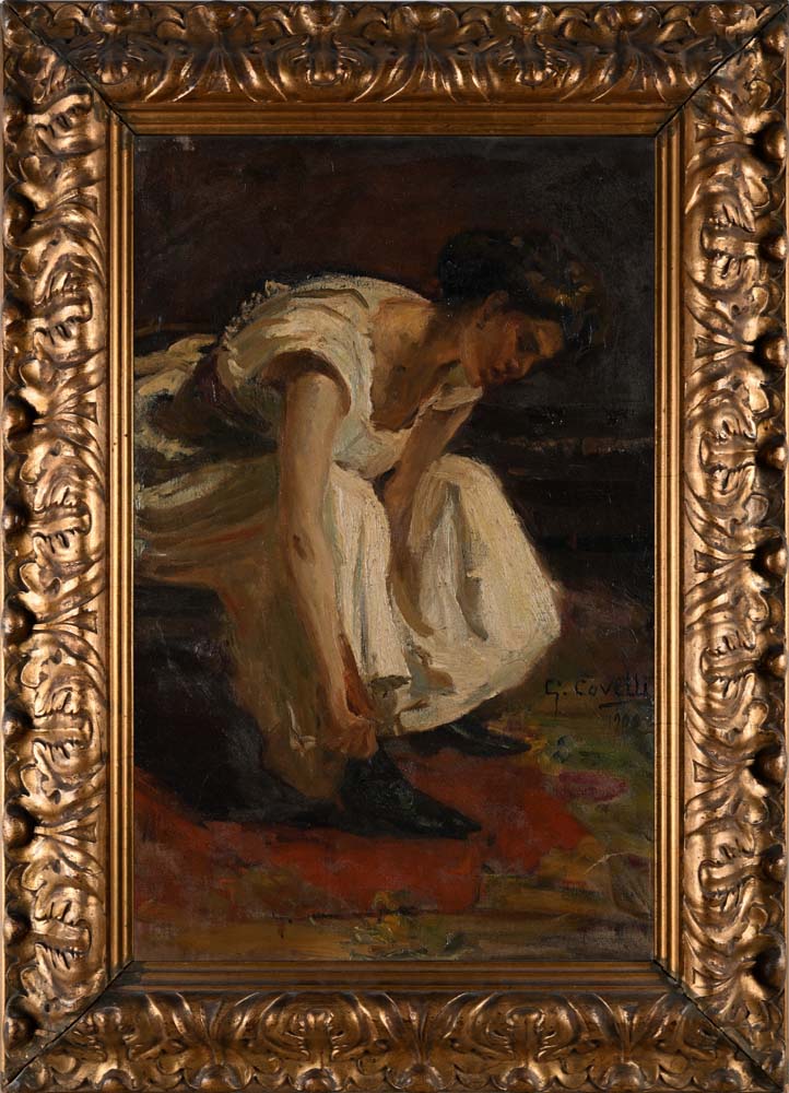 Giovane donna in un interno 1908 firmato e datato al centro verso destra G. Covelli / 1908 olio su tela cm 60 x 40 – in cornice cm 77,5 x 56