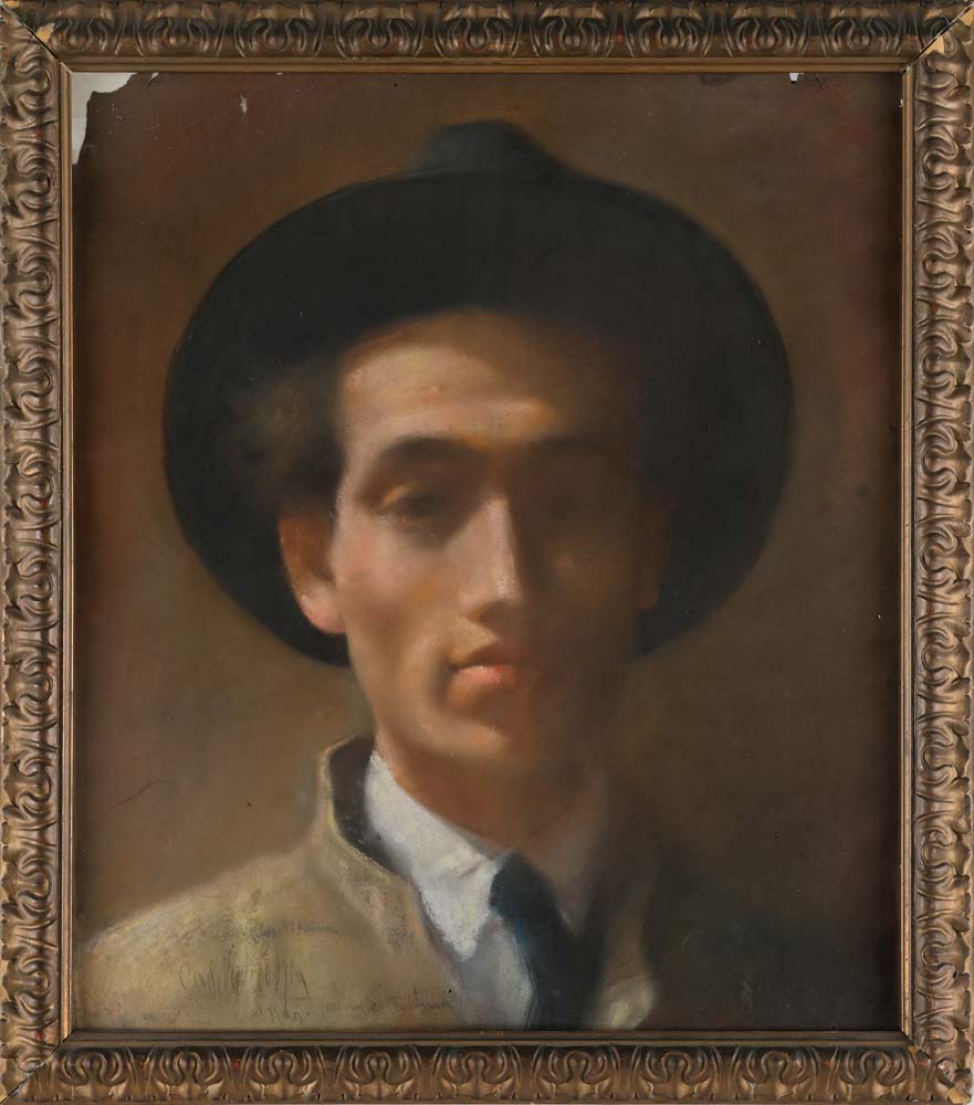 Giovane uomo con cappello nero firmato e dedicato in basso a sinistra Carlo Verdecchia / al Rag C … con stima pastello su cartoncino cm 48 x 41,5 – in cornice 54 x 48