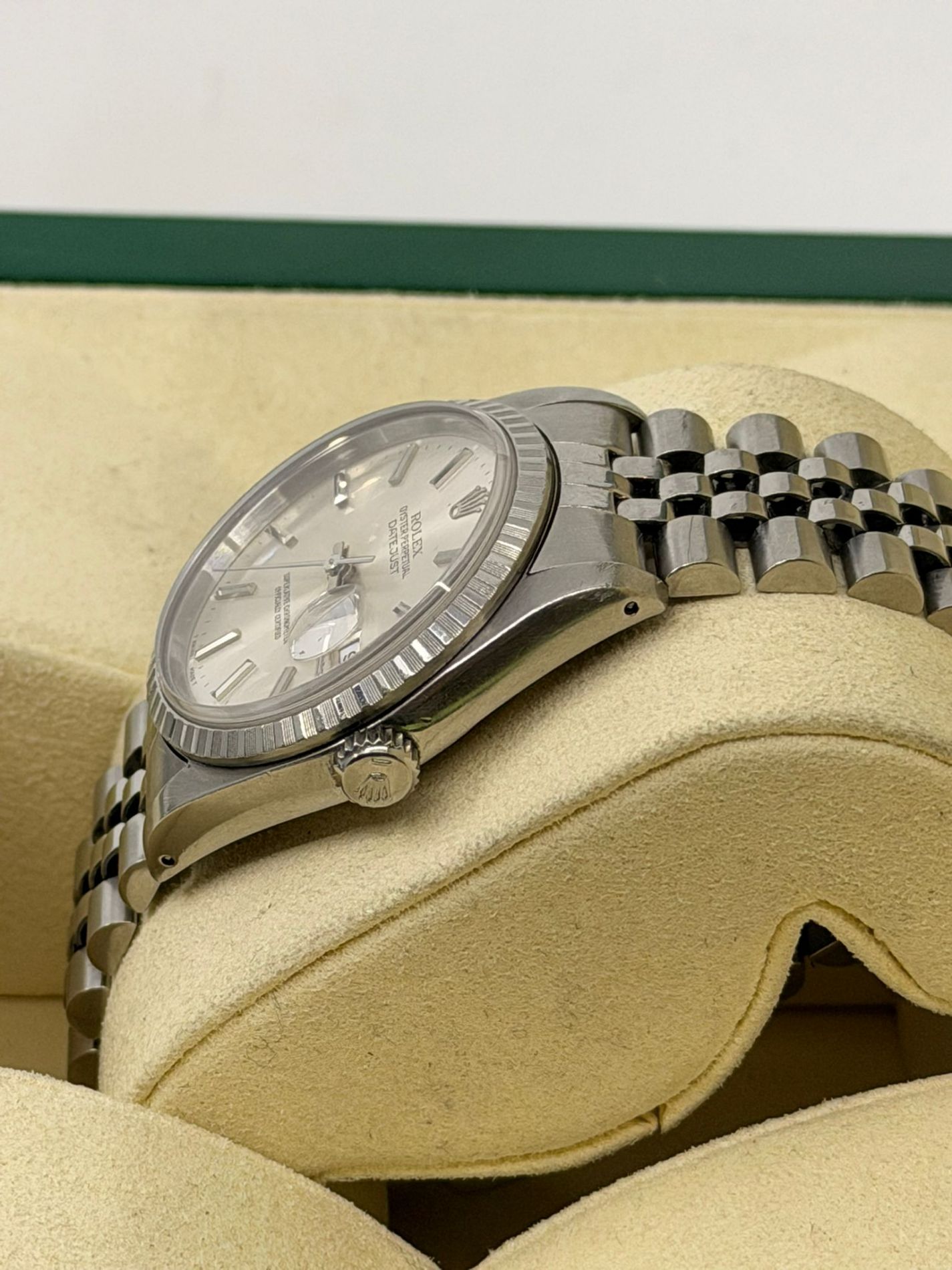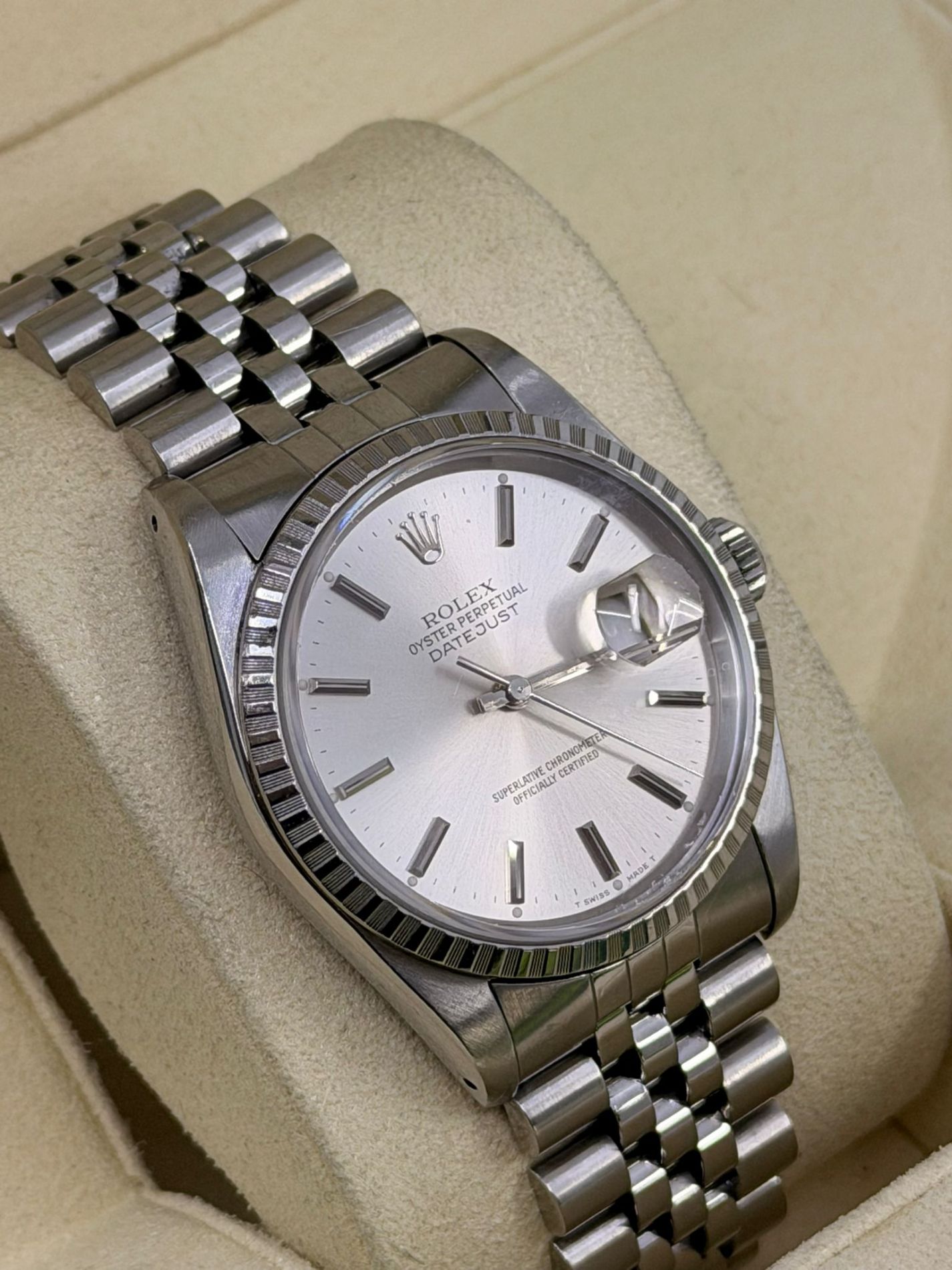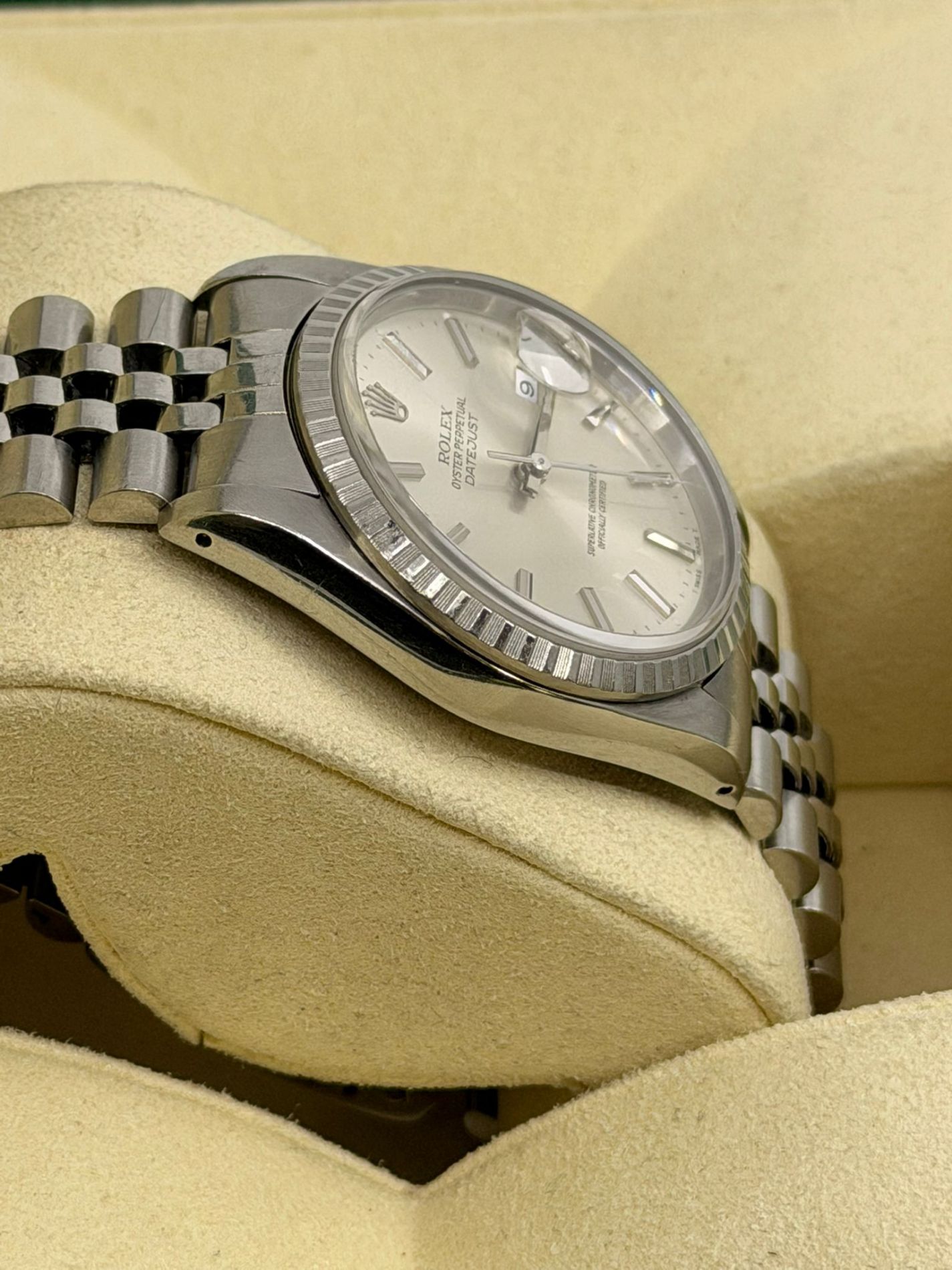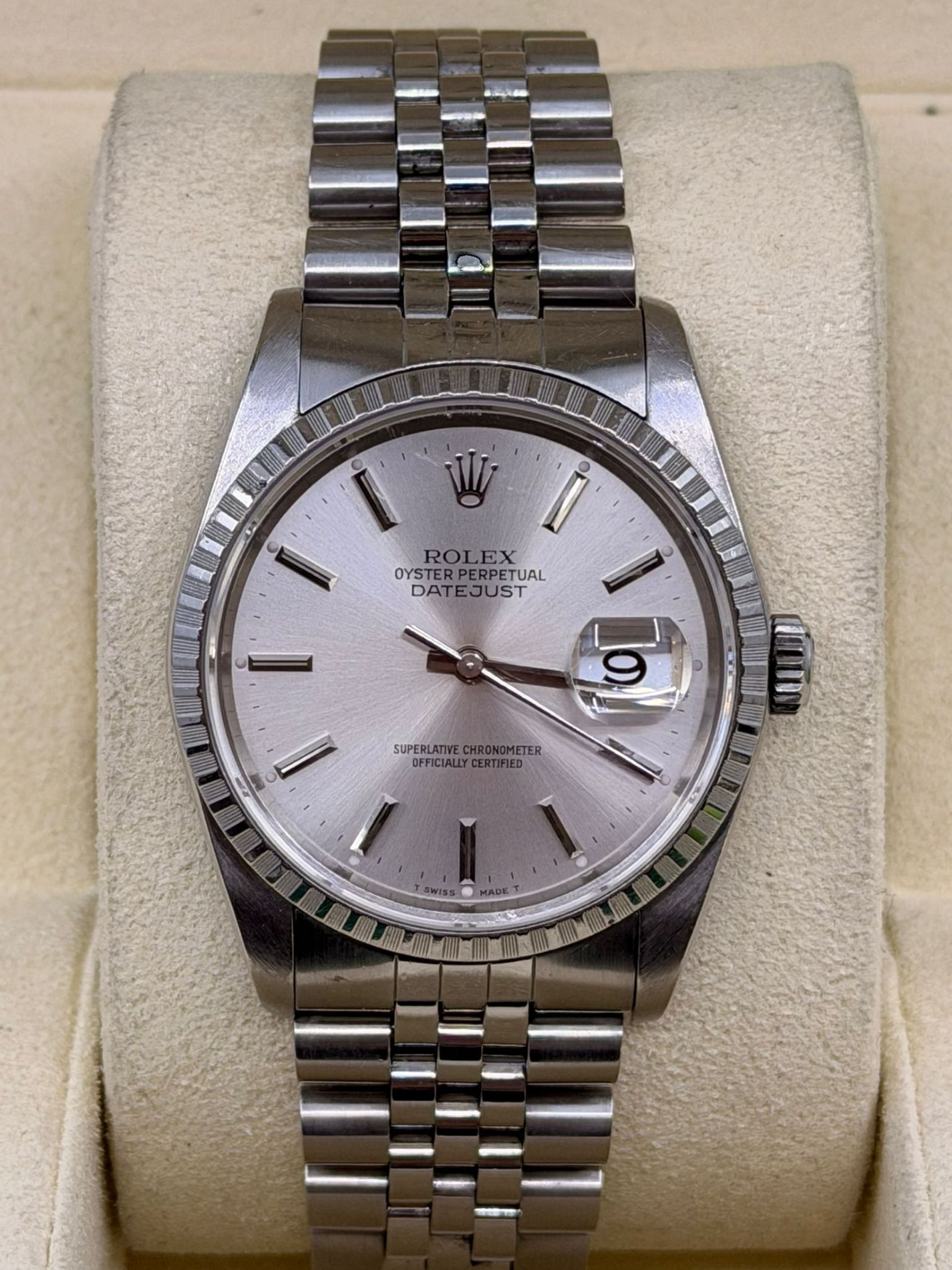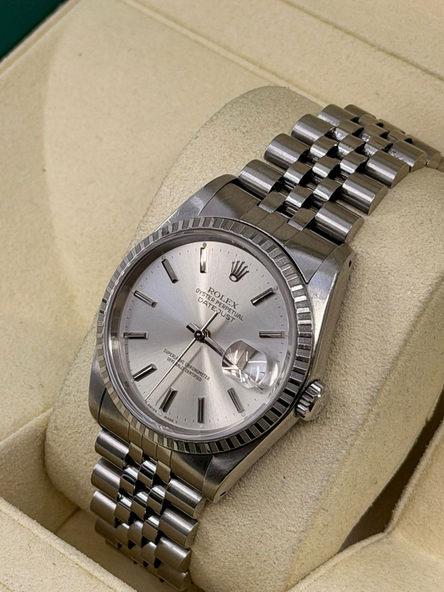 Marca Rolex Modello (Orologio) Datejust 36 Numero di referenza 16220 Anni 90 Carica Automatico Materiale della cassa Acciaio Materiale cinturino Acciaio Condizione Ottimo (di seconda mano, segni di usura assenti o appena visibili) Corredo Con documenti originali , senza scatola originale Un anno di garanzia del negozio Calibro Carica Automatico Materiale della cassa Acciaio Diametro 36 mm Impermeabile 10 ATM Materiale lunetta Acciaio Vetro Vetro zaffiro Cinturino Materiale cinturino Acciaio Colore cinturino Acciaio Chiusura Déployante Materiale chiusura Acciaio Funzioni Data - COMMISSIONE D’ASTA 23%