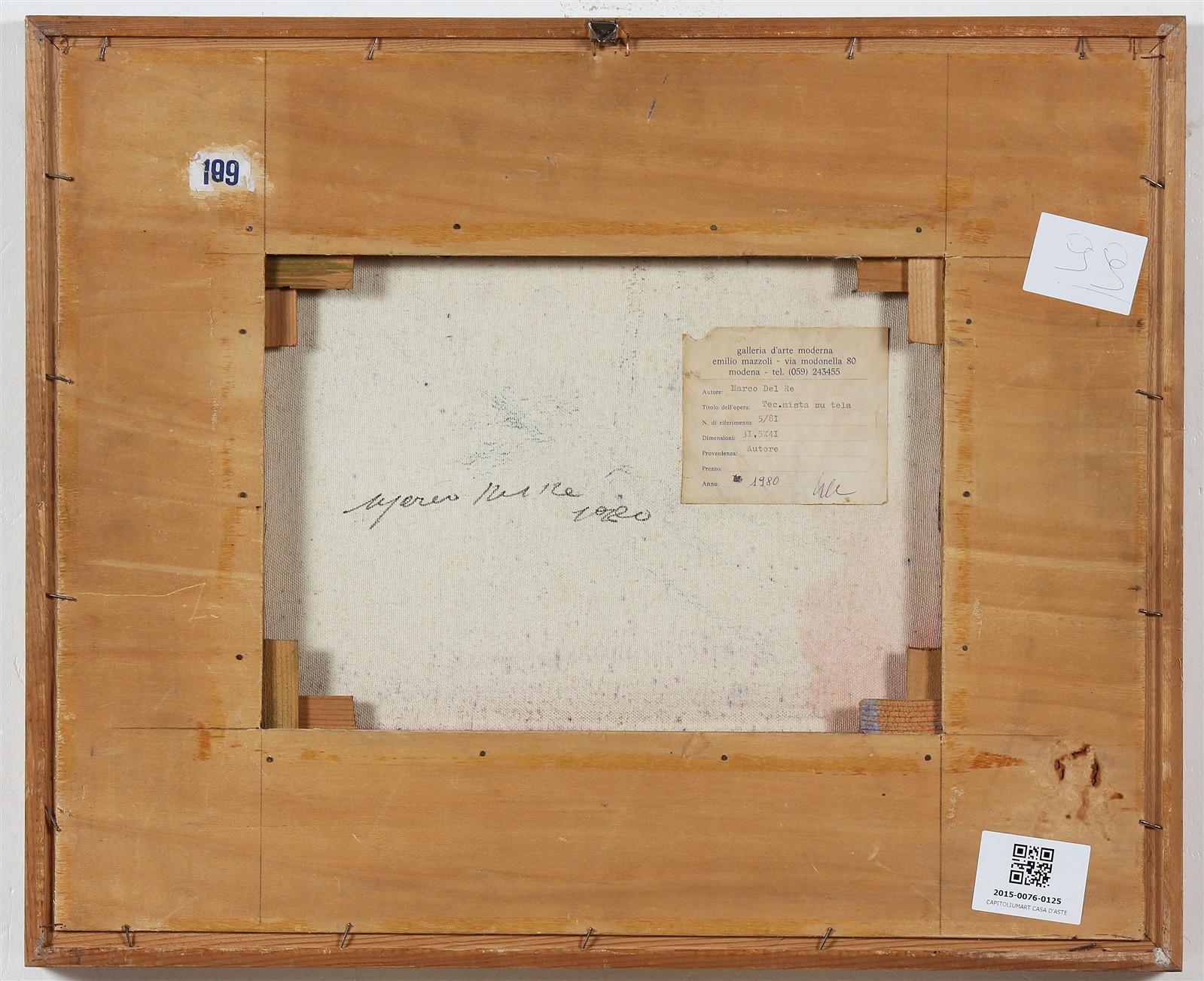 DEL RE MARCO (n. 1950) Senza titolo. Tecnica mista su tela. Cm 41,00 x 31,50. Al retro firma per autentica e cartiglio descrittivo a cura della Galleria d'Arte Moderna Emilio Mazzoli, Modena. Cornice presente