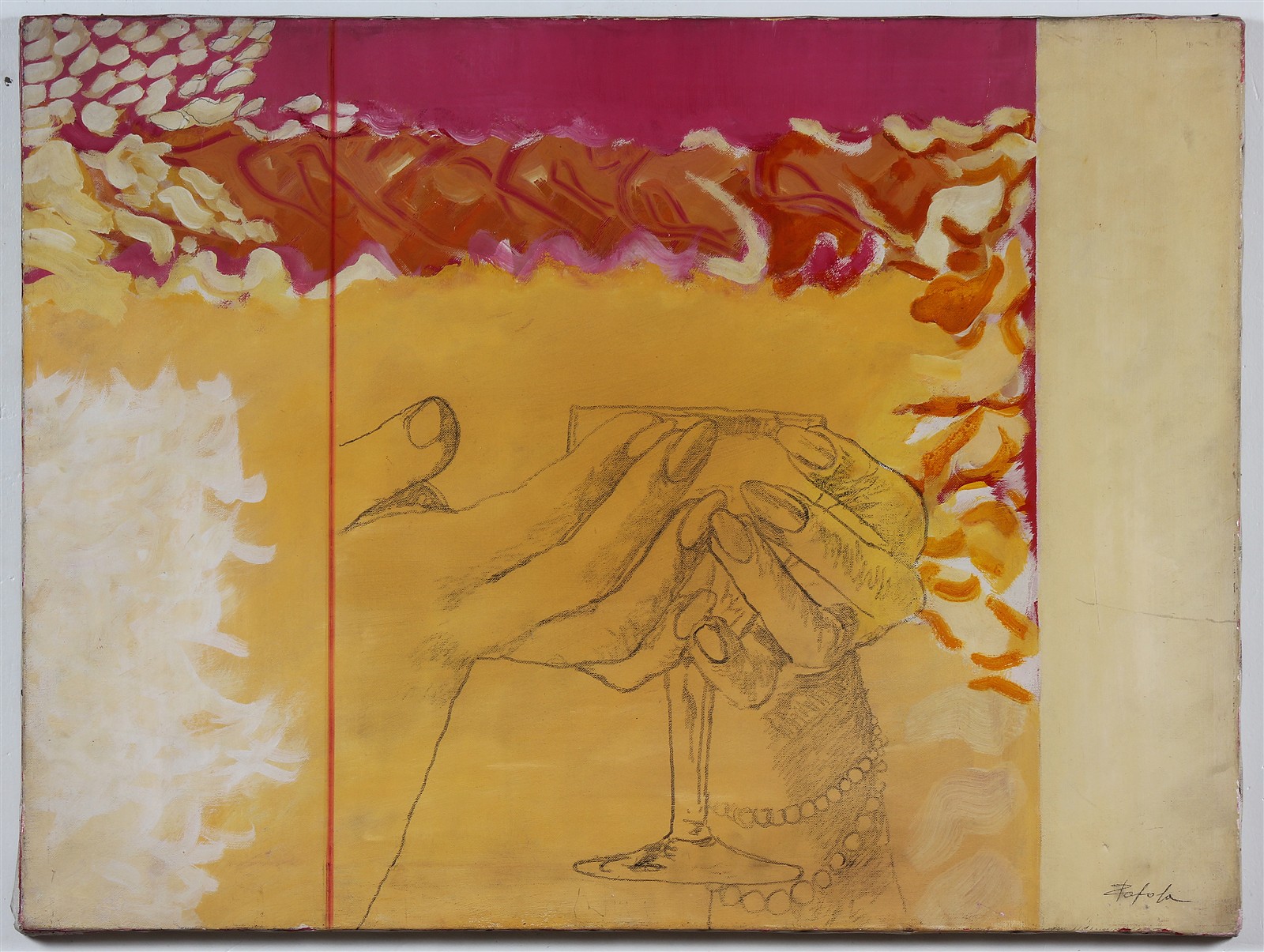 PAPOLA CLAUDIO (n. 1937) Senza titolo. Olio su tela . Cm 80,00 x 60,00. Firma in basso a destra. Al retro firma. Cornice presente