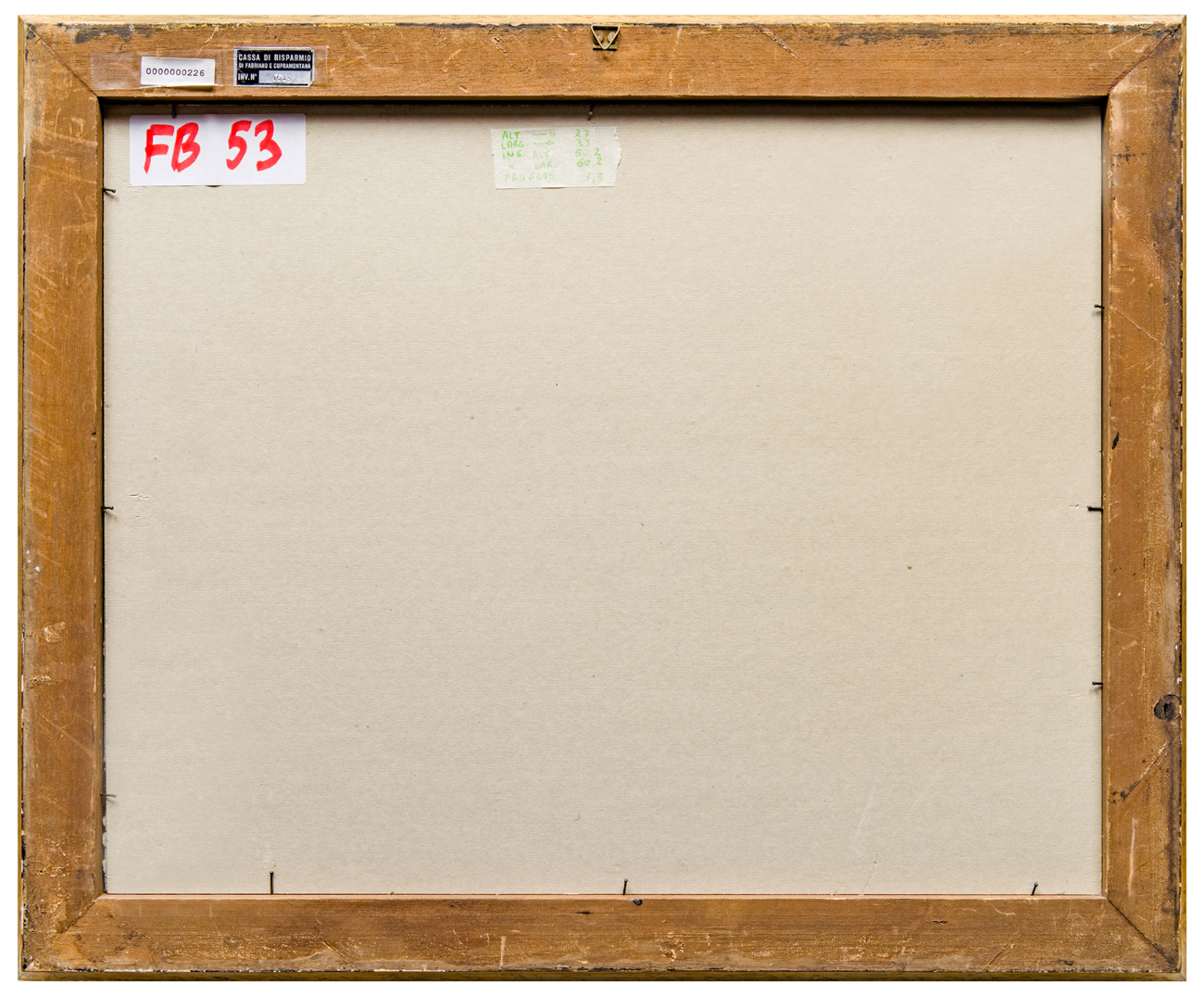 Elementi distintivi: sul verso, etichetta Cassa di Risparmio di Fabriano e Cupramontana con riferimenti di inventario